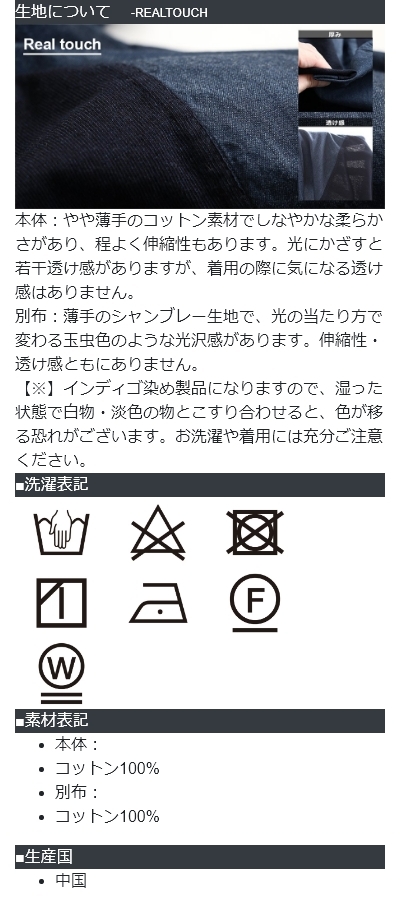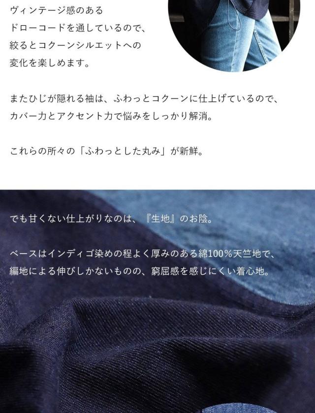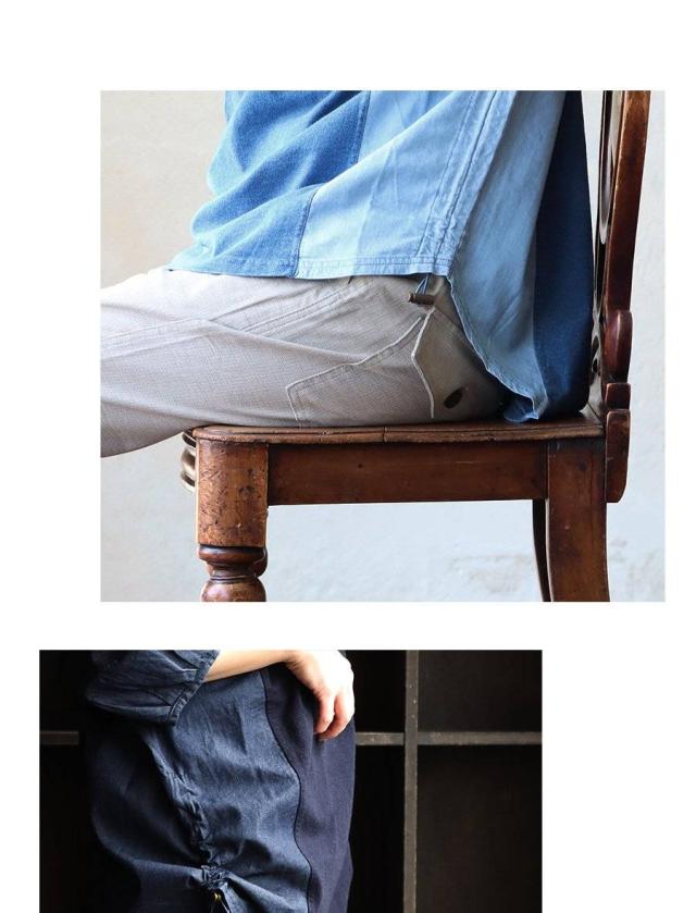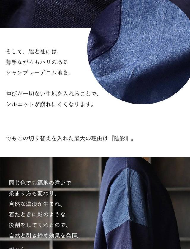 ・部分的に薄手ながらもハリのあるシャンブレーデニム地で切り替え、シルエットの引き締め効果をアップ。
