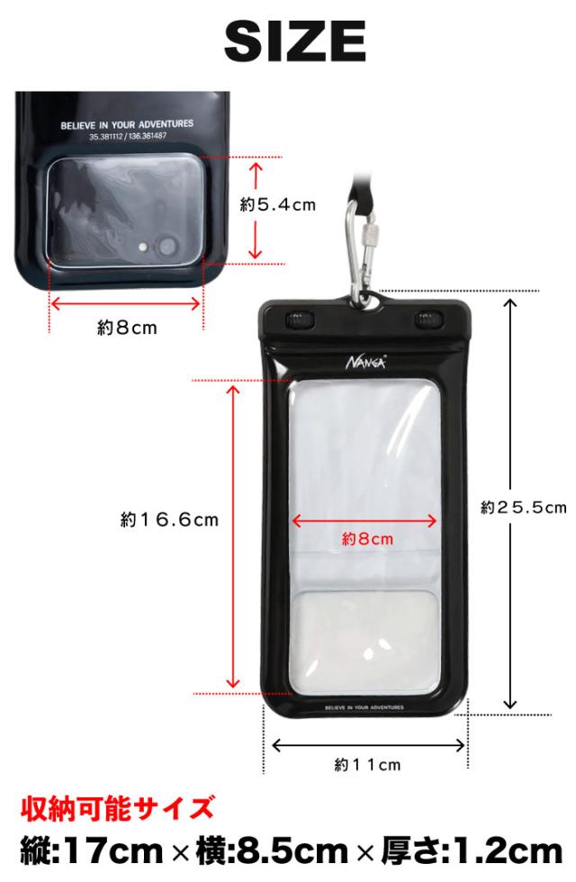 ・縦:17cm、横:8.5cm、厚さ:1.2cmまでのスマホが収納可能
