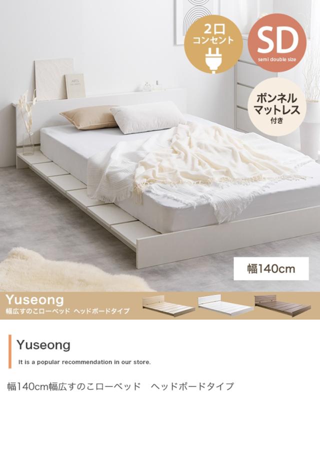 寝具 おしゃれ Yuseong 幅140cm幅広すのこローベッド ヘッドボードタイプ ボンネルマットレス付き セミダブル コンセント付き コンパクト ワンルーム 一人暮らし