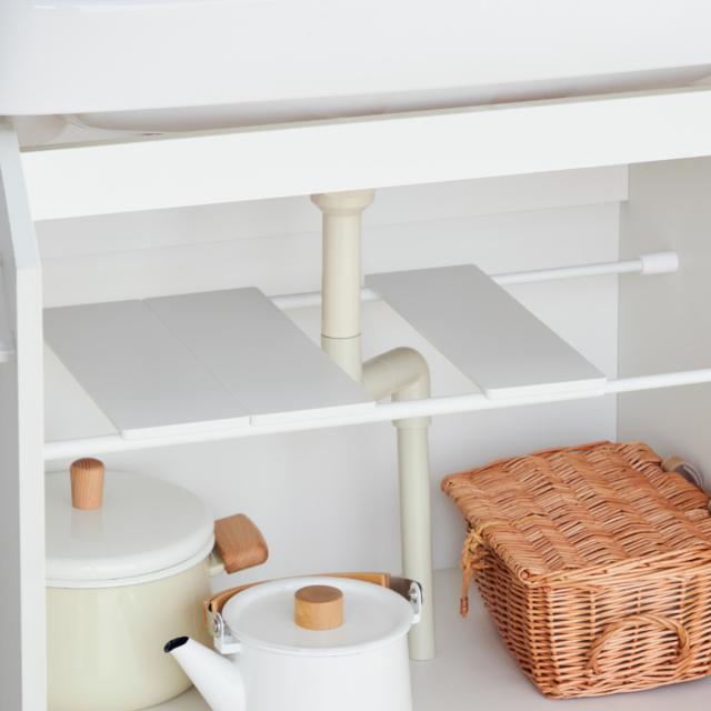 ●突っ張り棒2本にのせてシンク下やデッドスペースなどに棚を設置できるトレーです。