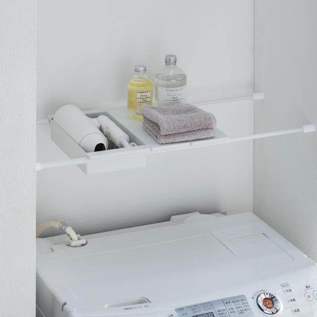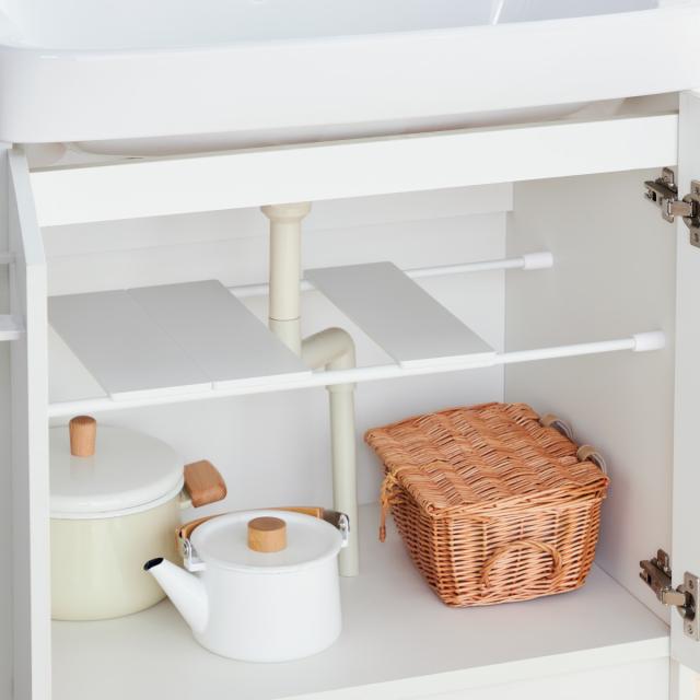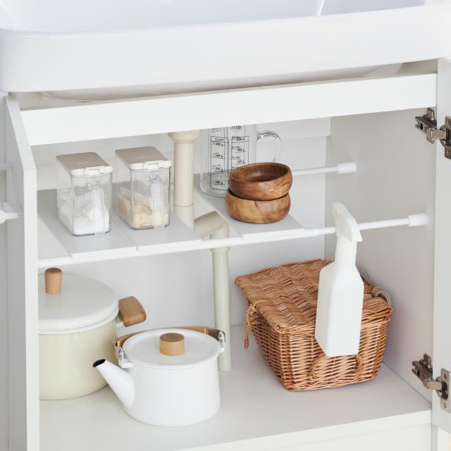 つっぱり棒を2本使い、同じシリーズのトレーやボックスを引っかければ、洗面台下やシンク下、洗濯機上や洗面所横の隙間を有効活用できます。