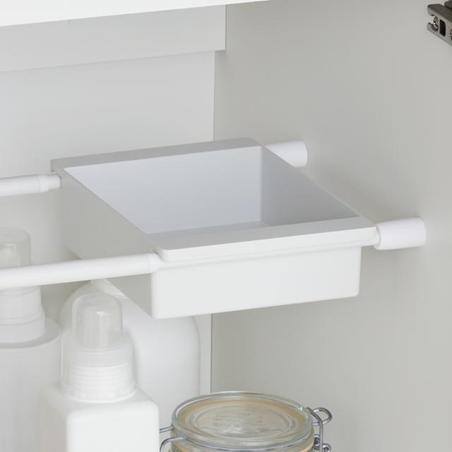 ●突っ張り棒2本にのせてシンク下やデッドスペースなどに収納棚を設置できる収納ボックスです。