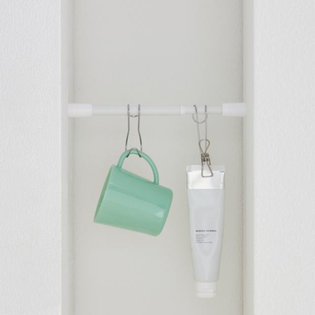 バネ式で簡単に取り付け・取り外しができ、壁に穴を開けずに収納やレールとして使用できます。