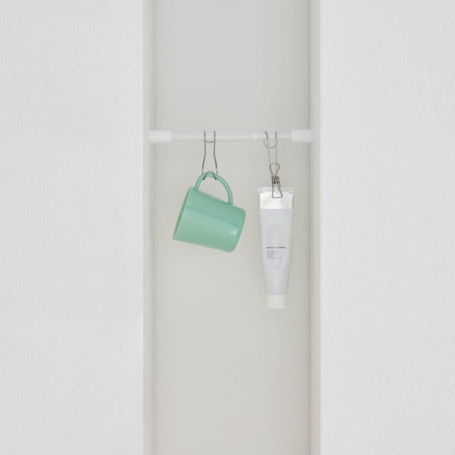 つっぱり棒を2本使い、同じシリーズのトレーやボックスを引っかければ、洗面台下やシンク下、洗濯機上や洗面所横の隙間を有効活用できます。