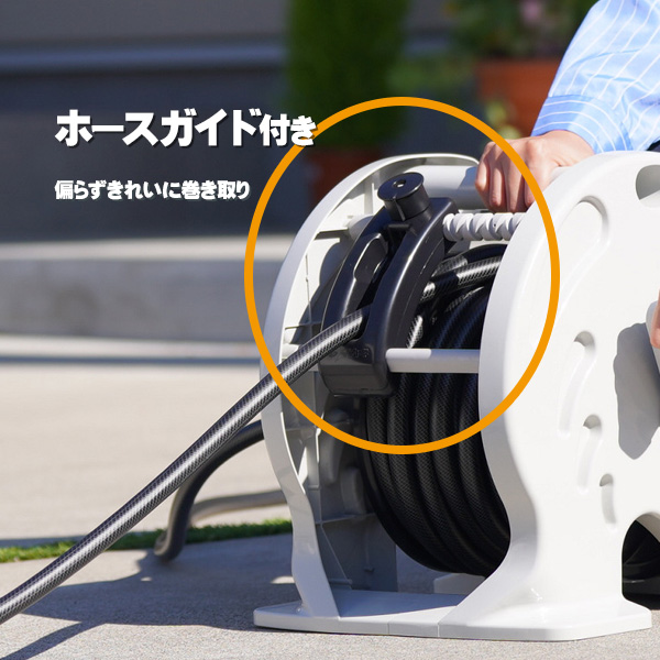 ホースガイドが左右に自在に動くので、ホースが片寄らずに巻き取れます。