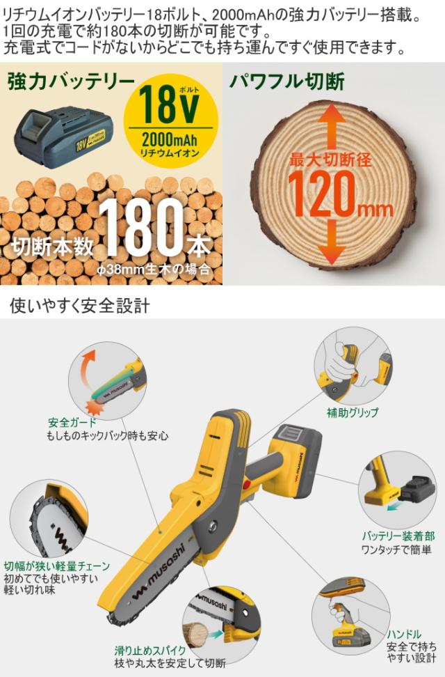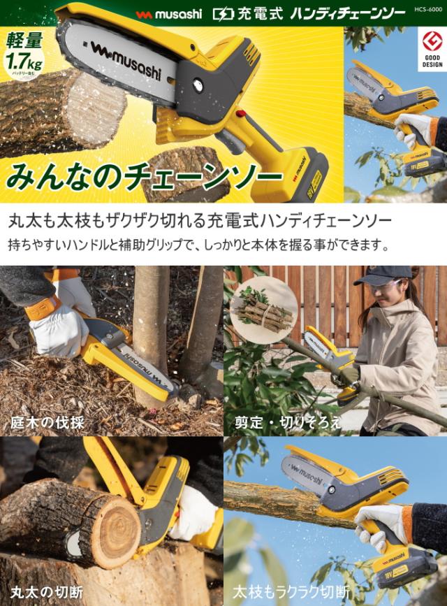 充電式 ハンディチェーンソー HCS-6000 送料無料 家庭用 電動工具 電気チェンソー 軽量 切断 庭木 丸太 角材 ムサシ