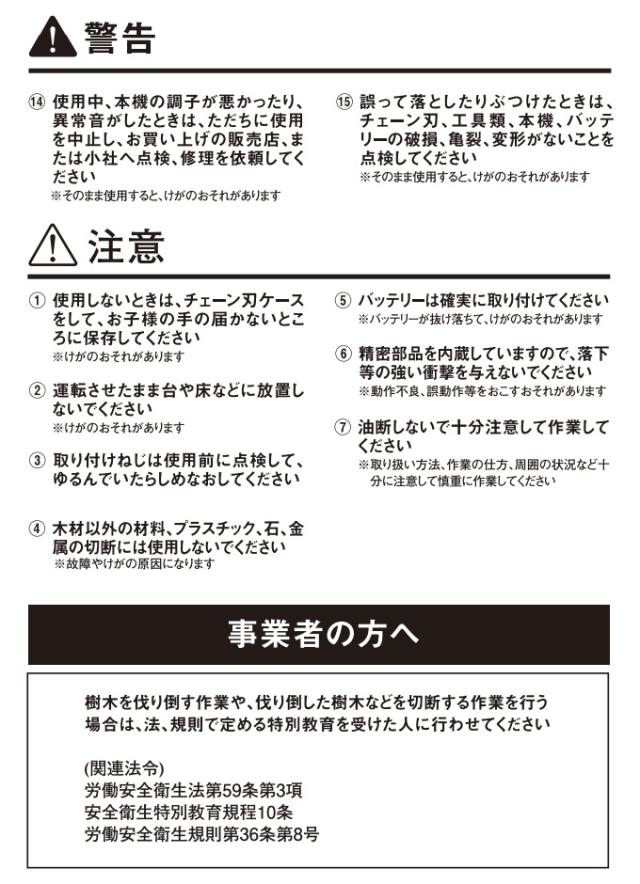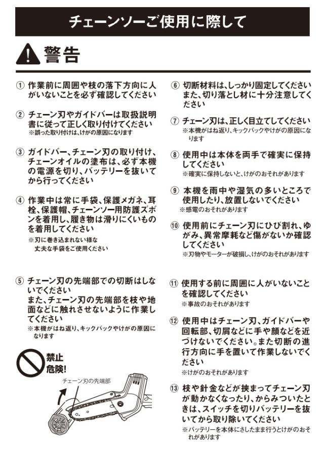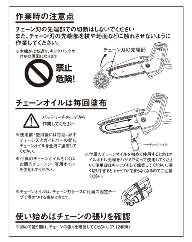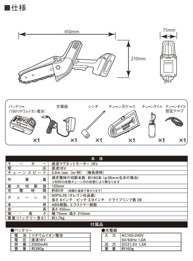 満充電時の切断本数:約180本(Φ38mm生木の場合) ※材料の状態チェーン刃の状態により異なります。 |