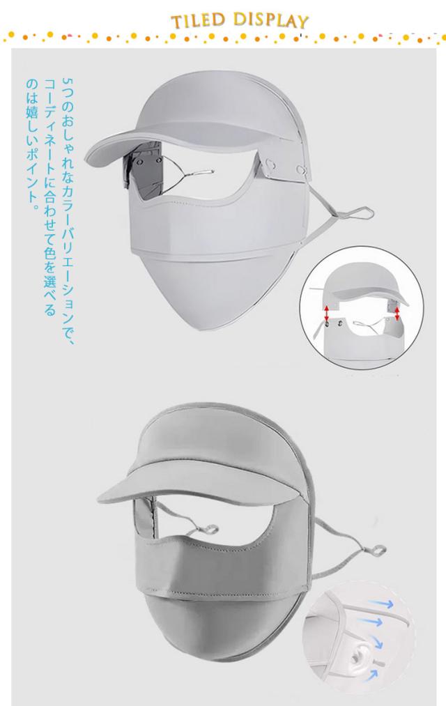 | 取り外し&一体型2タイプ! 【冷感&涼しい素材】 接触冷感素材で作られており、肌に触れる感触が柔らかくさらさらしています。着用するとひんやりとした感触があり、圧迫感もほとんど感じません! 【通気速乾性・息苦しくない】 開口デザインによって息がスムーズに排出されます。 優れた通気性により、汗が残らずに素早く乾く素材です。 熱の解散が早いため、ひんやり感がすぐに回復します。 伸縮性にも優れた素材を使用しており、男女関わらず、使えるユニバーサルデザインです。 人間工学に基づく設計と顔はぴったりフィットし、すべての顔型に適しており、使用後1秒で小顔になる効果があり、スタイリッシュで美しい。 【全面保護・紫外線対策】 頭も目も顔もしっかり保護できるので、紫外線から肌を守ることができます。 【幅広い耳ひも&調節可能】 耳ひもは伸縮性のある平ゴムを使用しており、耳が痛くなりにくいです。 調節可能なゴム製のイヤーストラップも付属しており、耳を引っ張ることなく完璧にフィットさせることができます。 5つのおしゃれなカラーバリエーションで、コーディネートに合わせて色を選べるのは嬉しいポイント。 【幅広いシーンに適応】 アウトドア、登山、ゴルフ、釣り、サイクリング、旅行、スポーツ観戦、キャンプ、日常生活、通勤、通学、園芸、野外作業、屋外作業などで紫外線や日焼け対策に広く使用されています。 | |