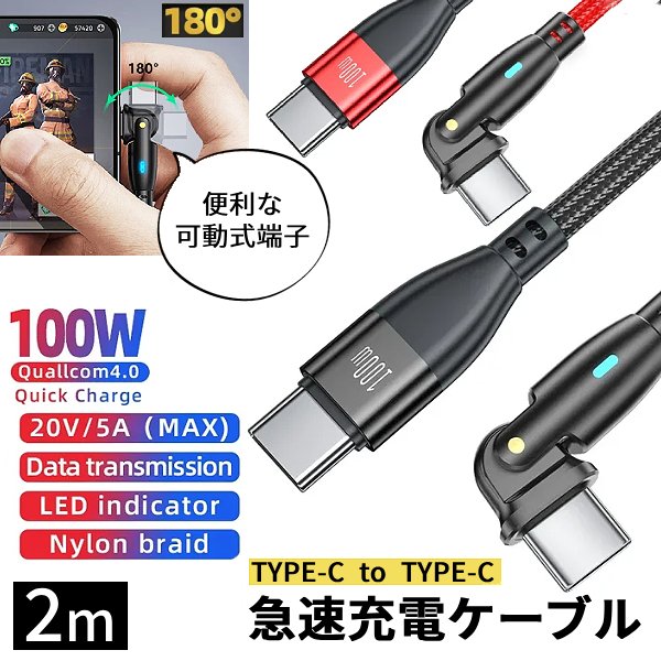 【TYPE-C】100W 2m 充電 ケーブル 高速充電 角度変更 180度回転 PC スマホ タブレット スマートフォン タイプC android iPhone アンドロイド