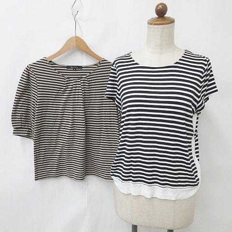 【中古】インディヴィ INDIVI ケティ KETTY カットソー 2枚 ボートネック 半袖 ボーダー リブ クルーネック 五分袖 白 黒 ベージュ 38