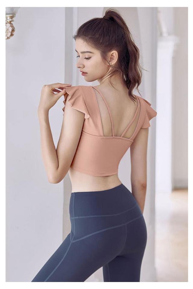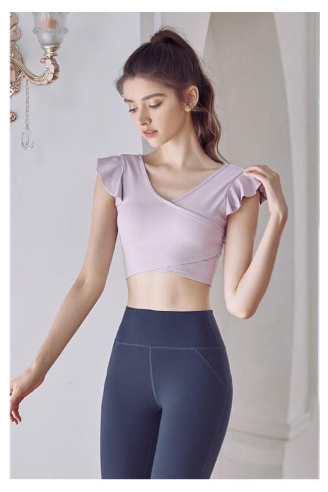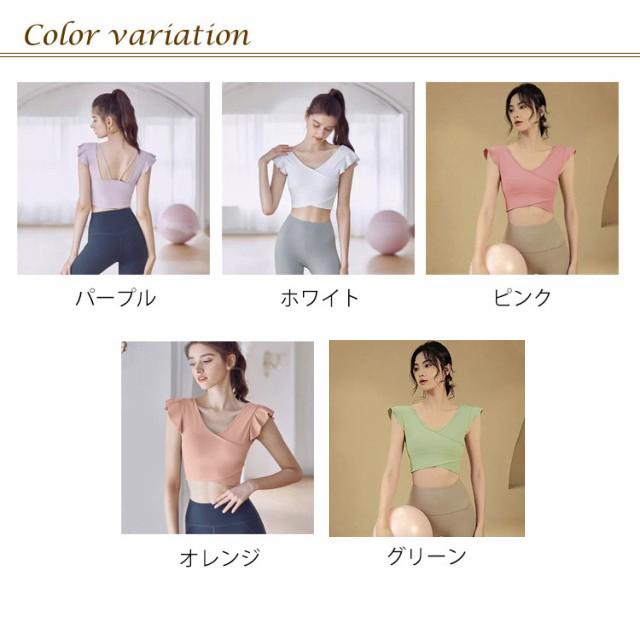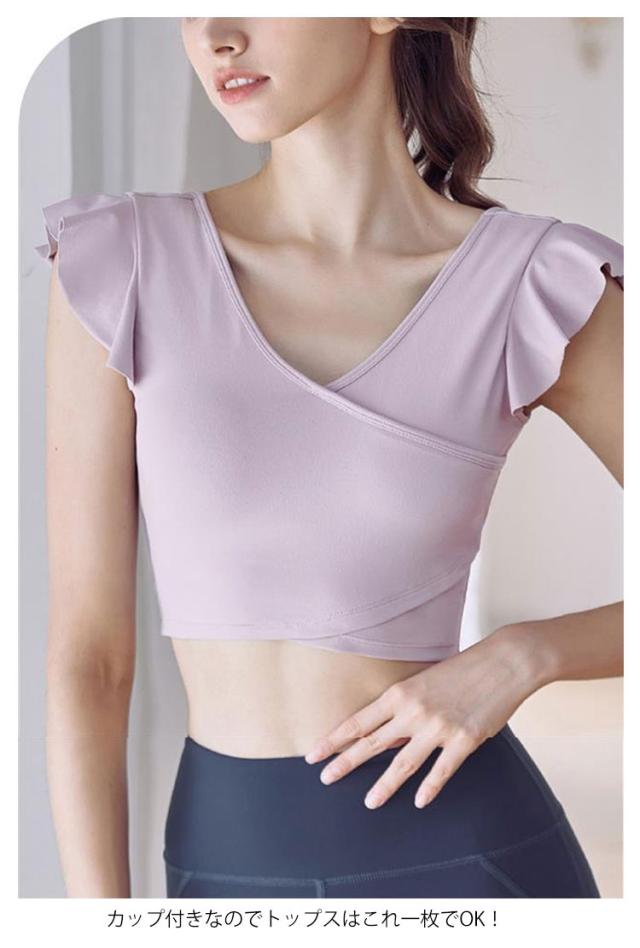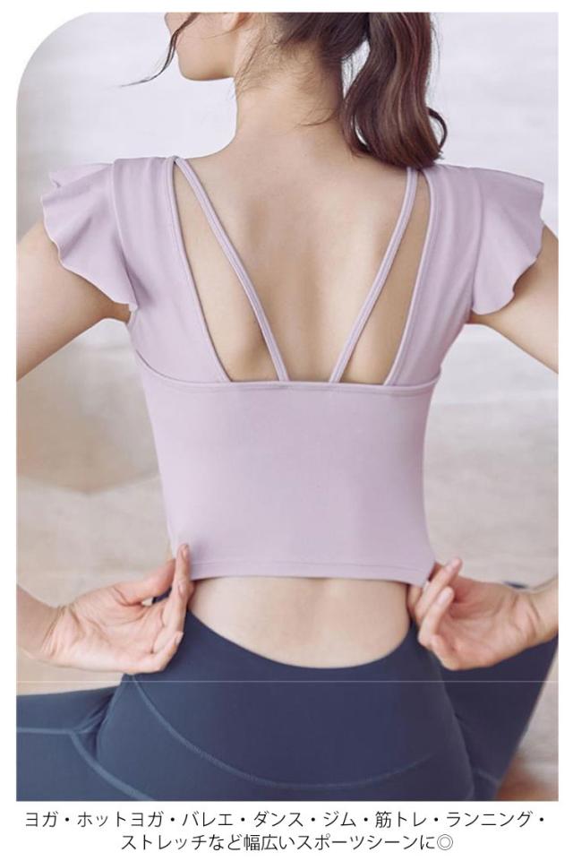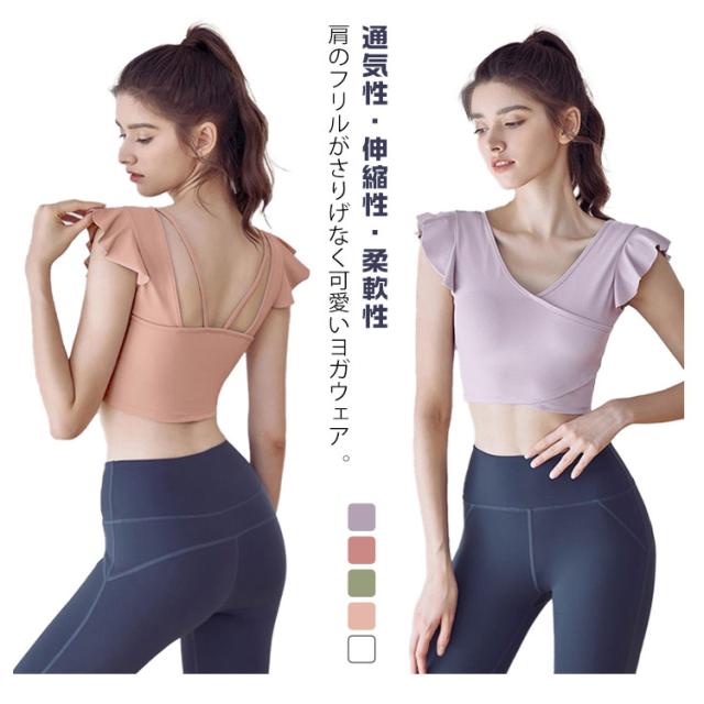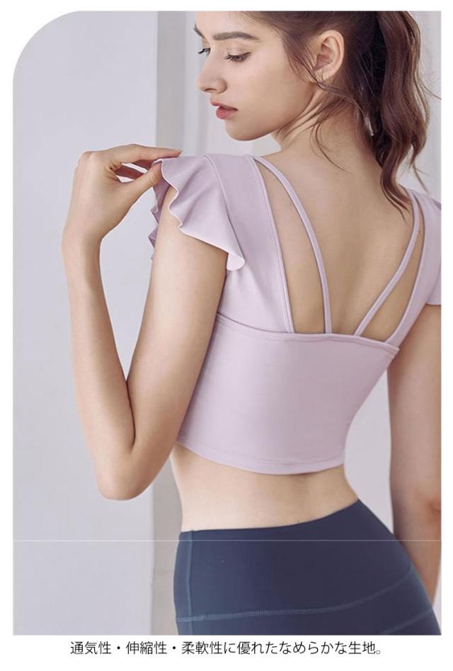 ヨガウェア トップス レディース 半袖ヨガトップス カップ付き ピラティス ウェア ショート丈 かわいい フリル へそ出し 伸縮性 パッド付き 無地 シンプル スポーツウェア フィットネス ホットヨガ ジムウェア ダンス トレーニング ウェア