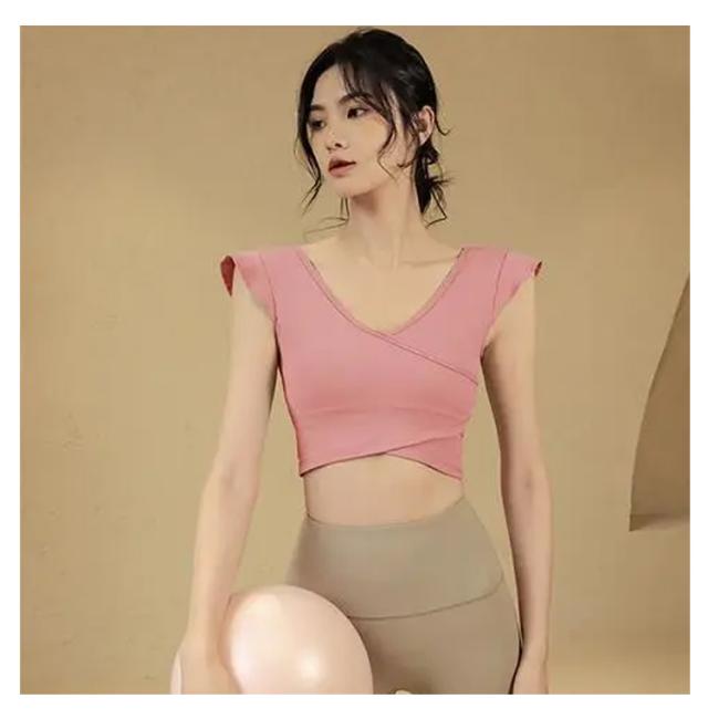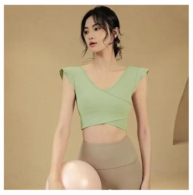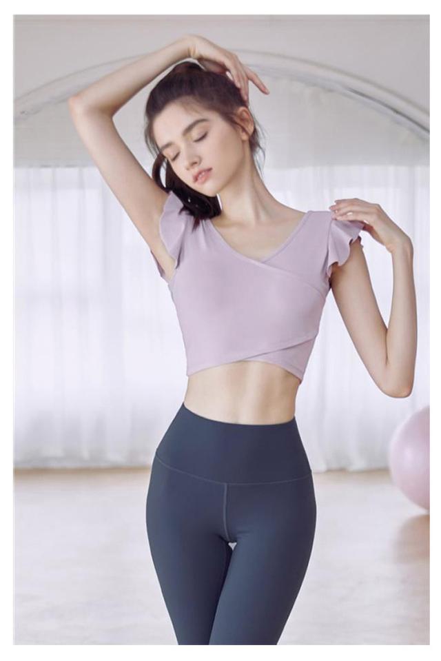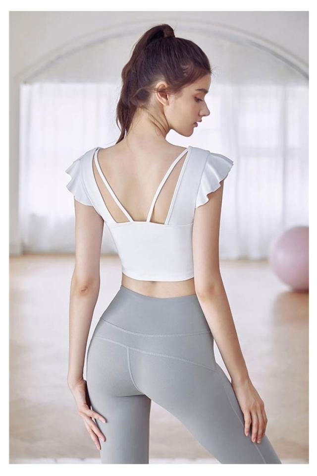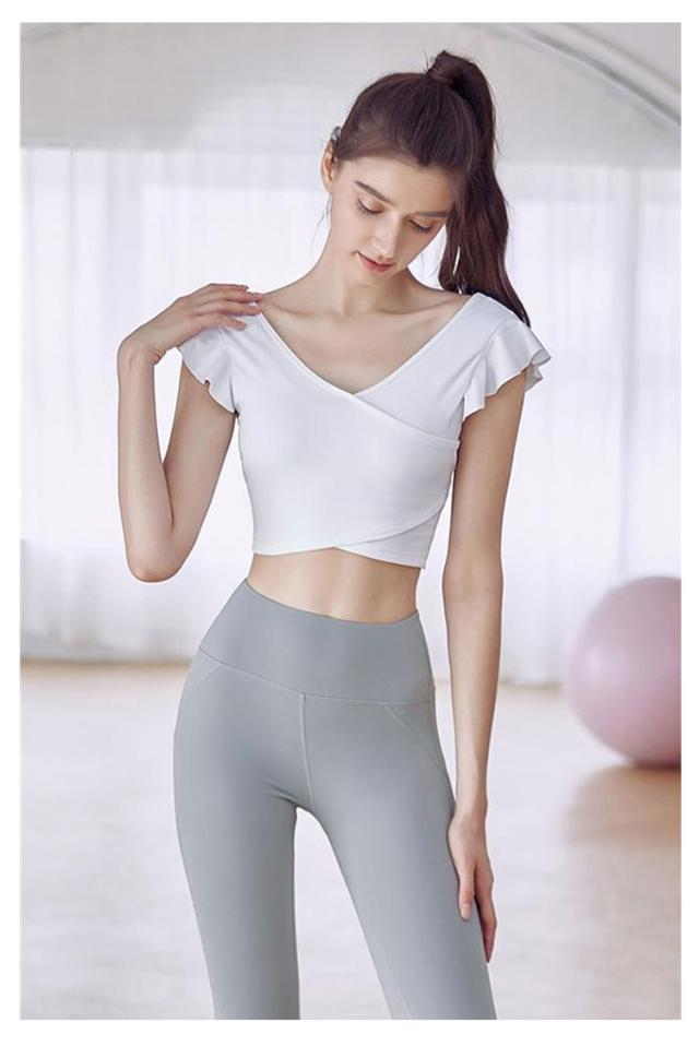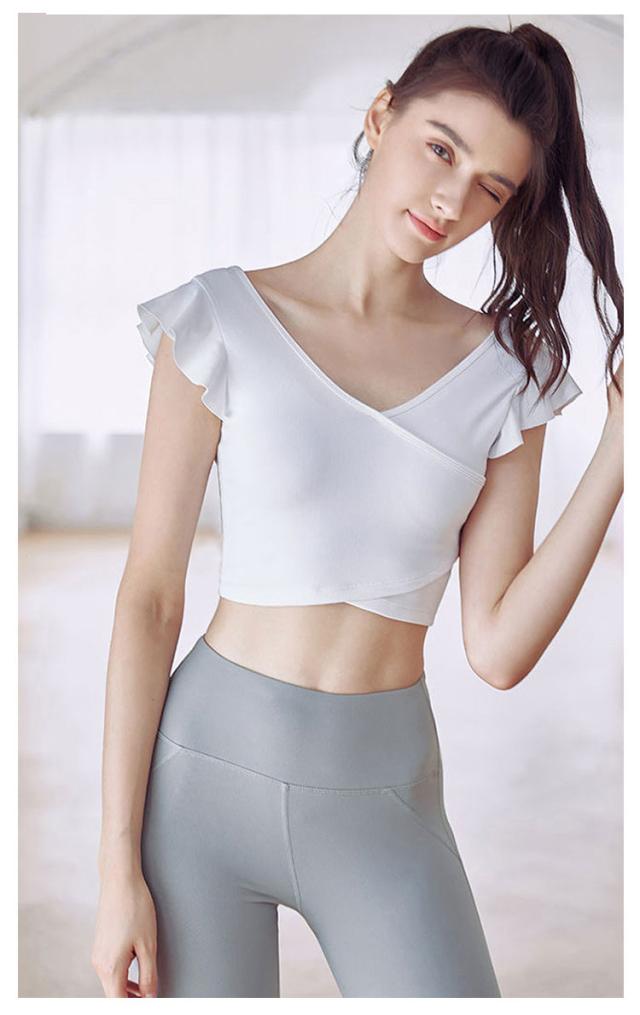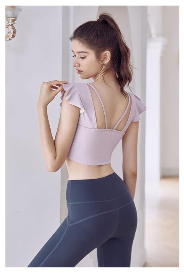 ヨガウェア トップス レディース 半袖ヨガトップス カップ付き ピラティス ウェア ショート丈 かわいい フリル へそ出し 伸縮性 パッド付き 無地 シンプル スポーツウェア フィットネス ホットヨガ ジムウェア ダンス トレーニング ウェア