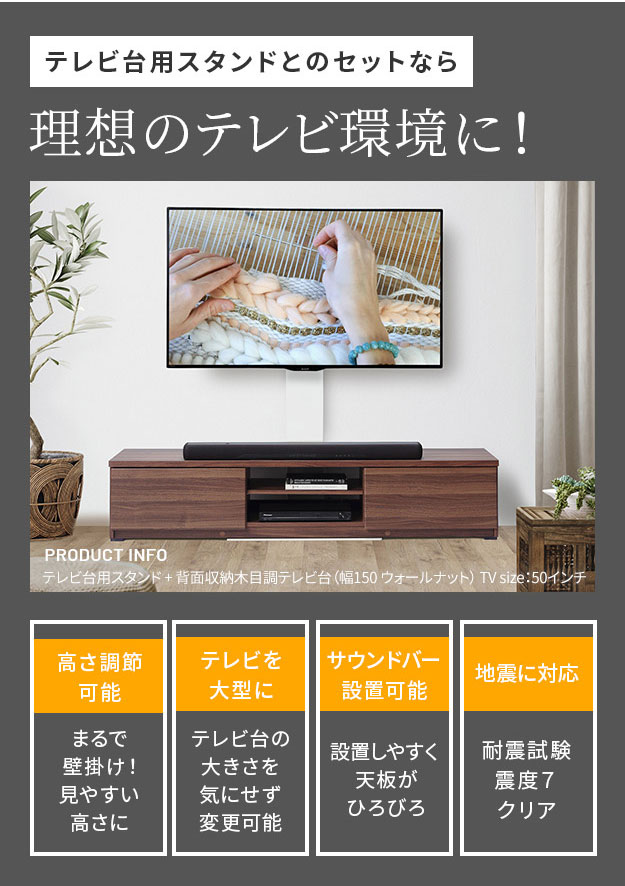 【震度7耐震試験済み/32〜60インチ対応】WALL(ウォール) インテリアテレビスタンド テレビ台用スタンド+背面収納木目調テレビ台セット 幅150cm 2色対応 テレビ台 TVスタンド 高さ調節 リビング 寝室 おしゃれ