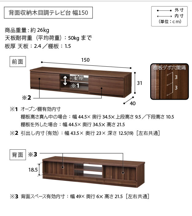 背面収納木目調テレビ台:W150 x D40 x H31cm