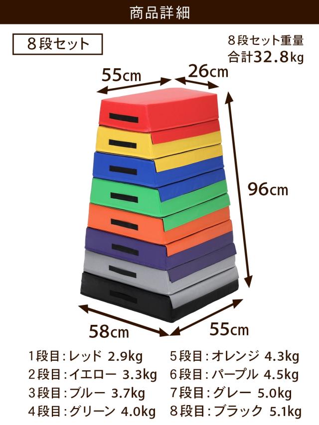 お子様の運動能力・やる気を育てるソフトタイプの跳び箱8段セットになります!商標登録済みの重反発ウレタンを採用したことでズレない跳び箱が出来上がりました。