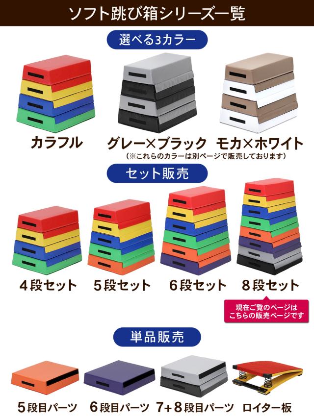 【拡張性が高いから成長に合わせて使い分けが出来る】ソフト跳び箱シリーズは4〜8段までご利用出来ます。4段セットを買った人も追加で購入出来るように単品の販売も行っております。