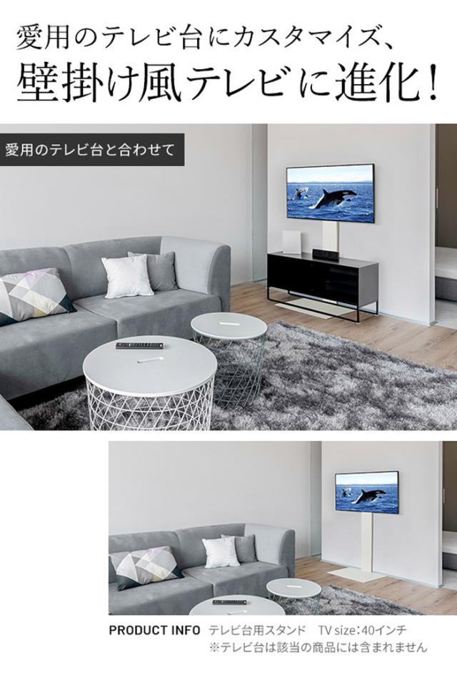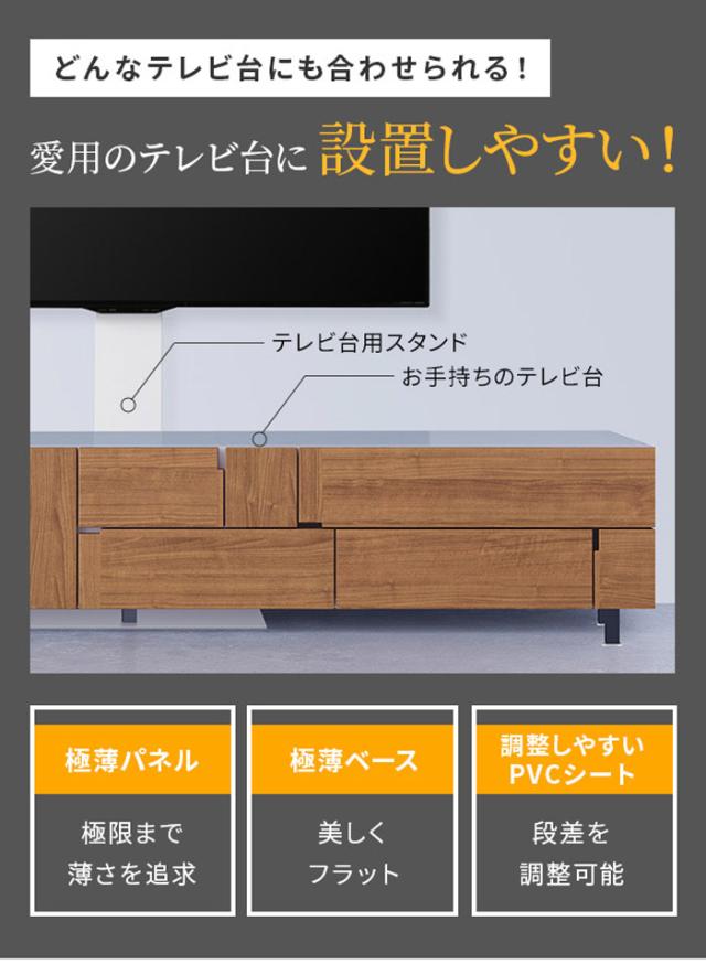 お持ちのテレビ台と組み合わせることで、今まで通りの収納力を維持しながら、テレビの視聴環境を改善するテレビスタンドです。愛用中のテレビ台を無駄にせず、テレビの高さを変えることができるだけでなく、テレビ台からはみ出すような大きなテレビを設置することが可能になります。また、テレビ台を設置しない単独の状態でも使用可能。支柱の奥行き約4cm、ベースが5?oのため、より壁掛けのようにテレビを設置したり、パソコンのモニタースタンドとしても活用いただけます。