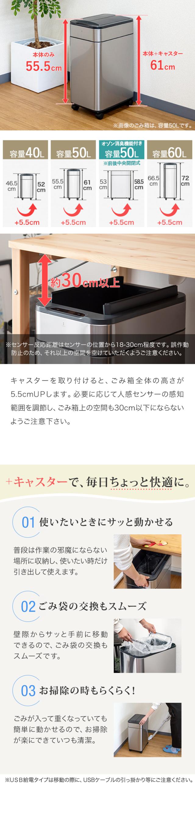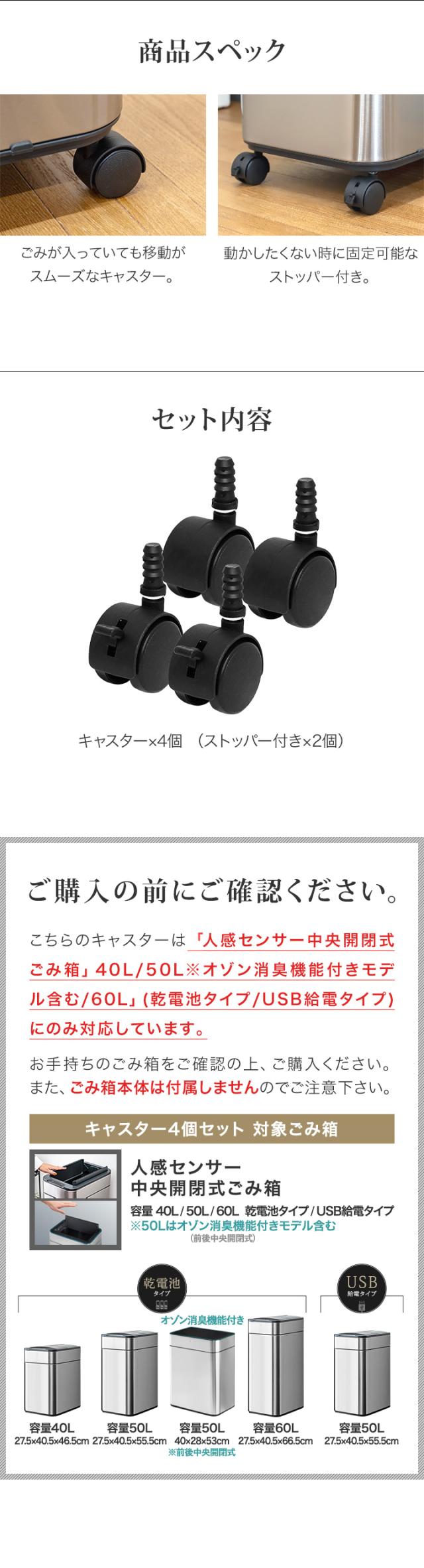| 特記事項: ・こちらのキャスターは「人感センサー中央開閉式ごみ箱」40L/50L※オゾン消臭機能付きモデル含む/60L」(乾電池タイプ/USB給電タイプ)にのみ対応しています。 ・ごみ箱本体は付属いたしませんのでご注意ください。 |
