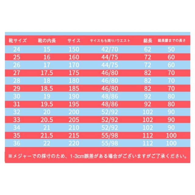 | サイズについての説明 | 靴サイズ 靴の内長 サイス もも周り/ウエスト 総長 腰までの長さ ※メジャーでの採寸のため、1-3cm誤差がある場合がございますがご了承ください。 |