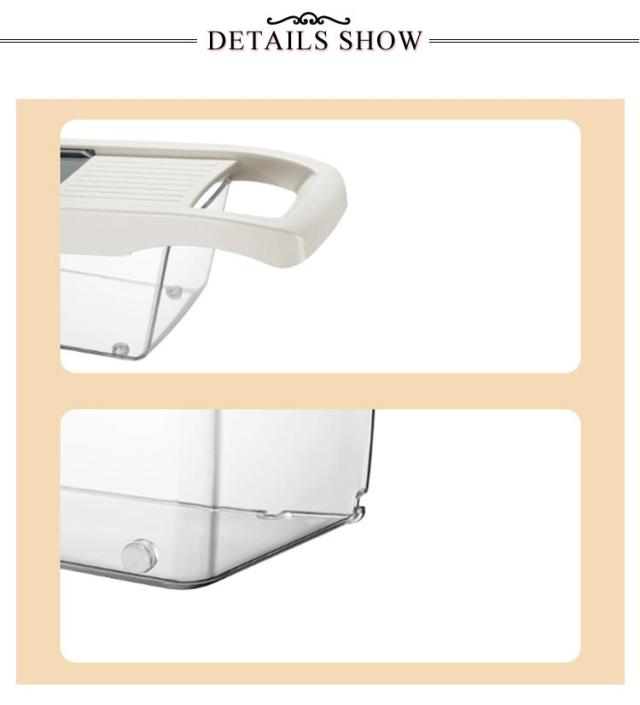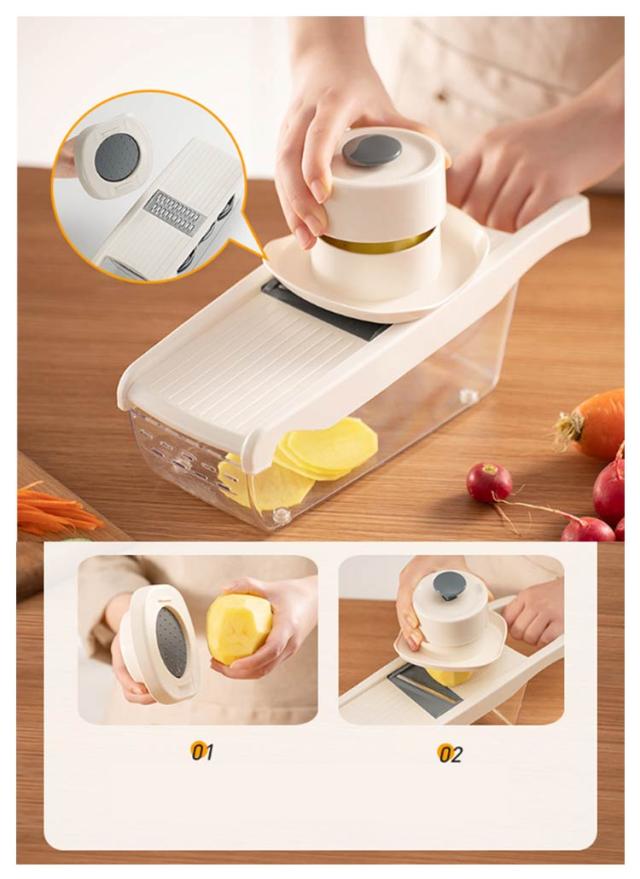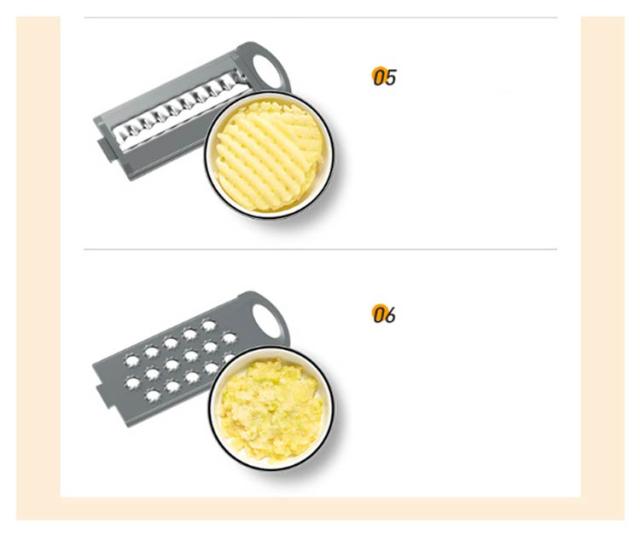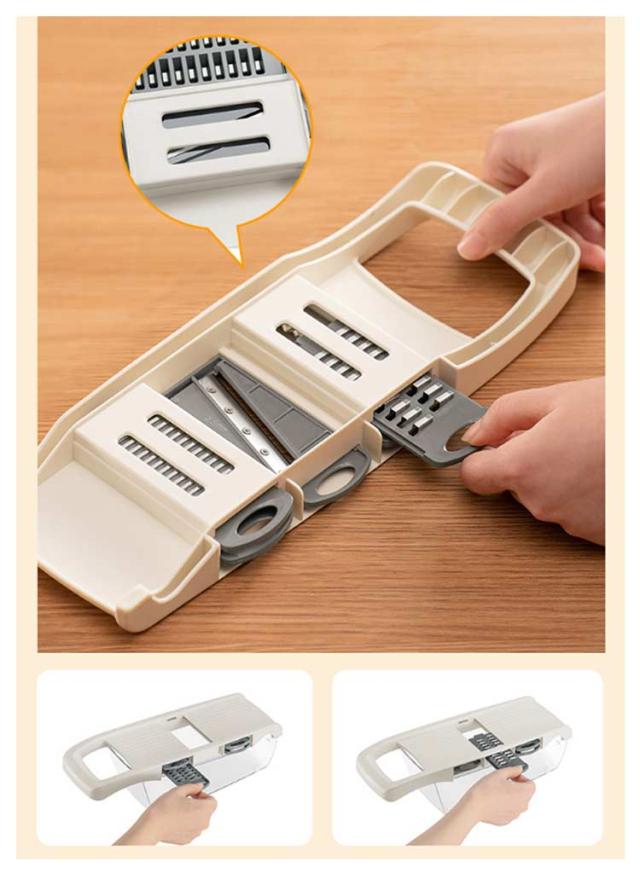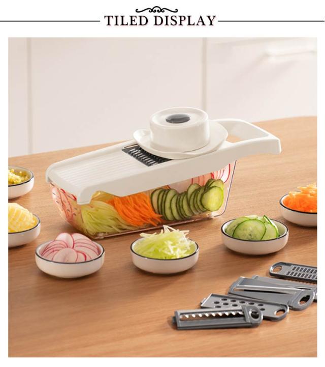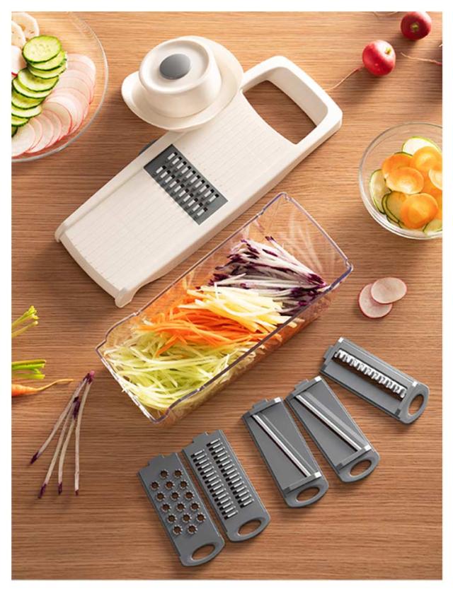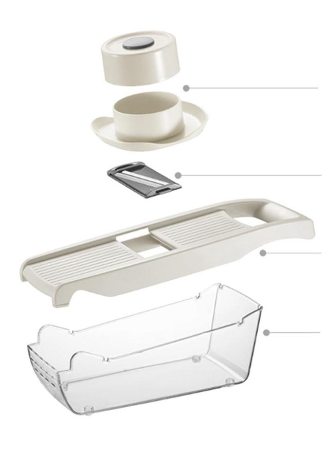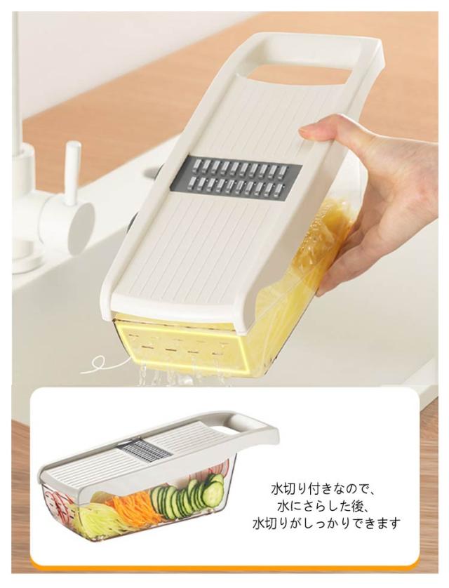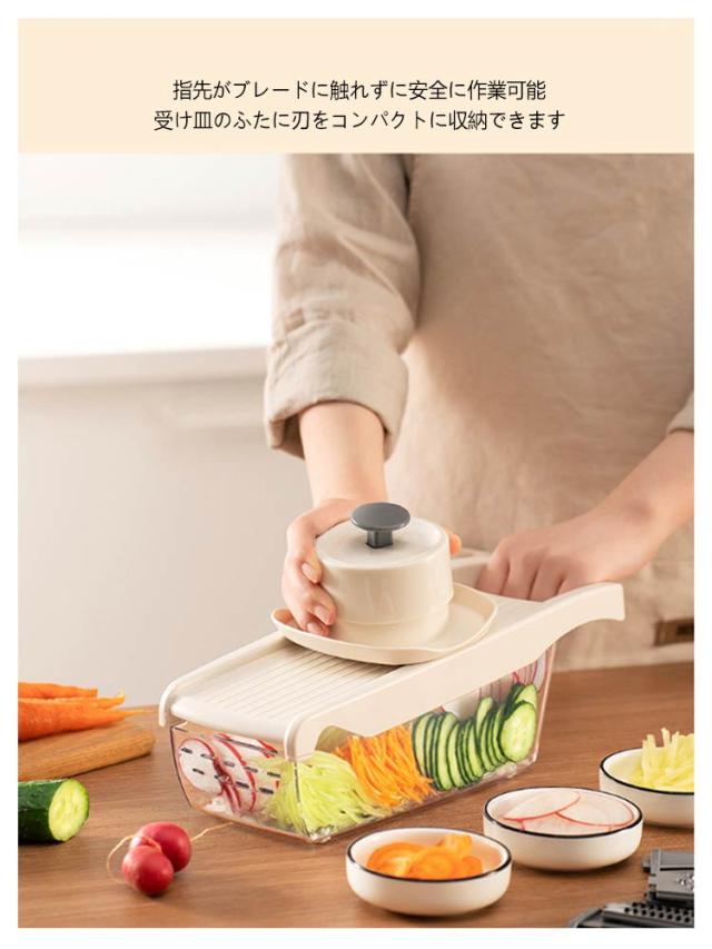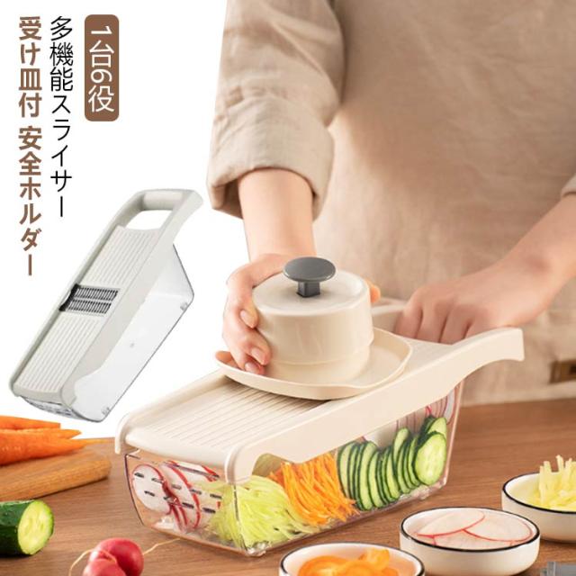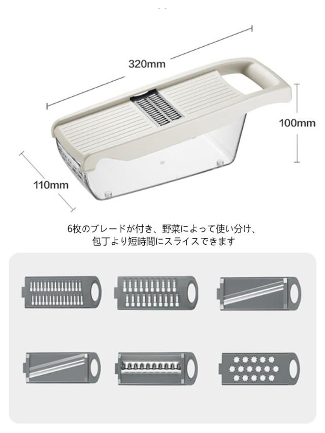 | 多機能スライサー 受け皿付 安全ホルダー 6枚のブレードが付き、野菜によって使い分け、包丁より短時間にスライスできます 水切り付きなので、水にさらした後、水切りがしっかりできます 指先がブレードに触れずに安全に作業可能 受け皿のふたに刃をコンパクトに収納できます | |