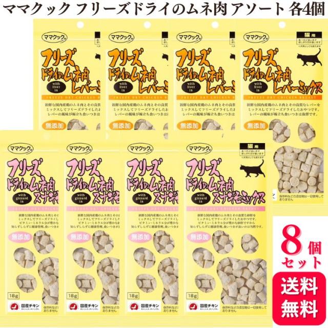 【送料無料】【8袋セット】 ママクック フリーズドライのムネ肉 アソート レバーミックス スナギモミックス 18g 各4袋 猫用 フリーズドライ レバー スナギモ ムネ肉 おやつ チキン 鶏肉 国産 安全 安心 自然 無添加 ネコ キャットフード 鶏 トッピング ふりかけ チャック付き 送料無料