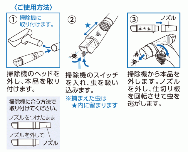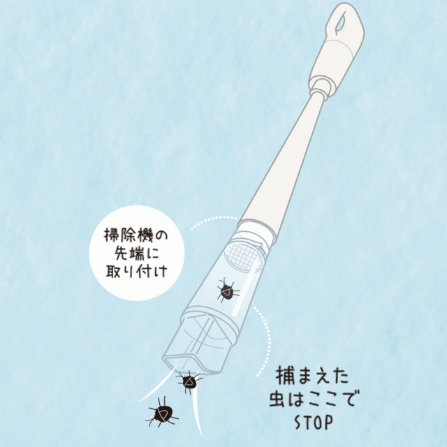 掃除機のパイプに取り付けて、虫から少し離れた位置から虫を捕獲できる。 ※本品は、、掃除機は付属しておりませんのでご注意ください。