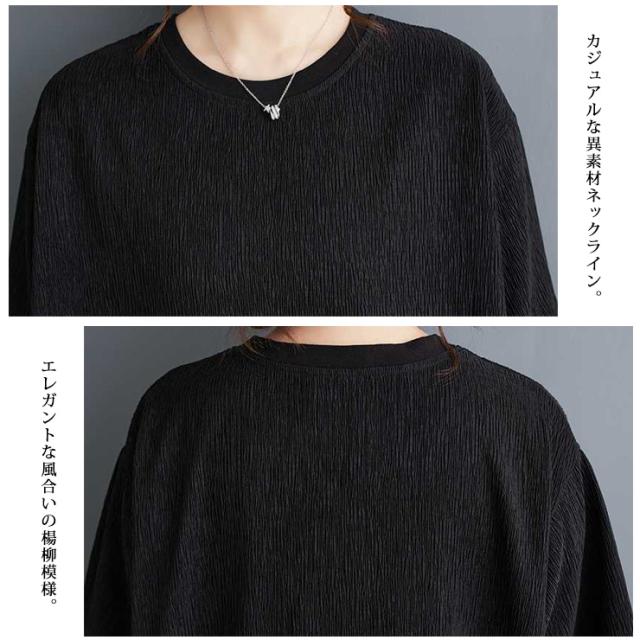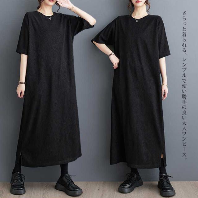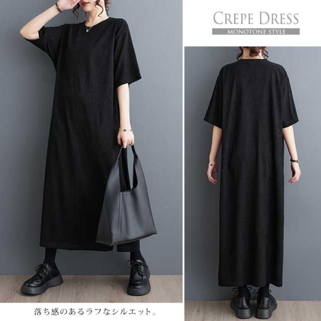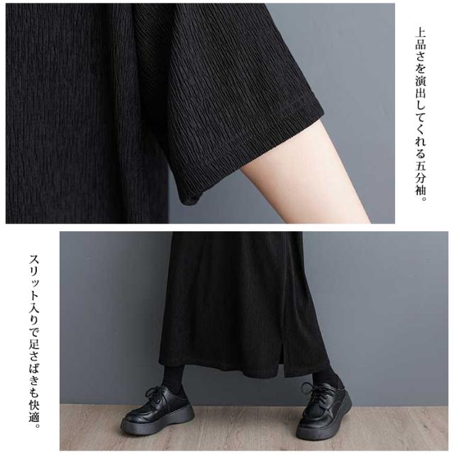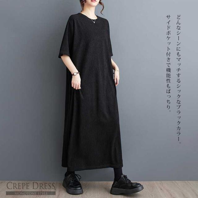 大きいサイズ レディース ロングワンピース 黒ワンピ 無地 五分袖 クレープ ドロップショルダー 夏 (549365)