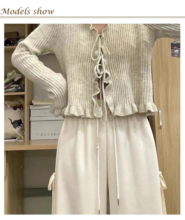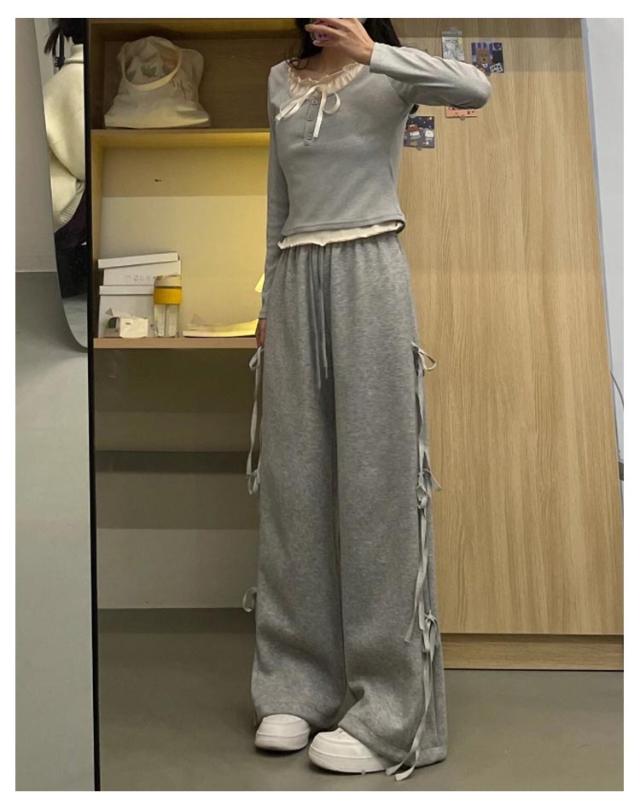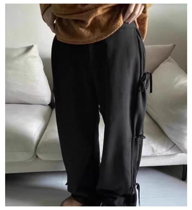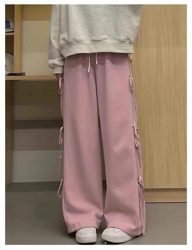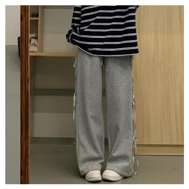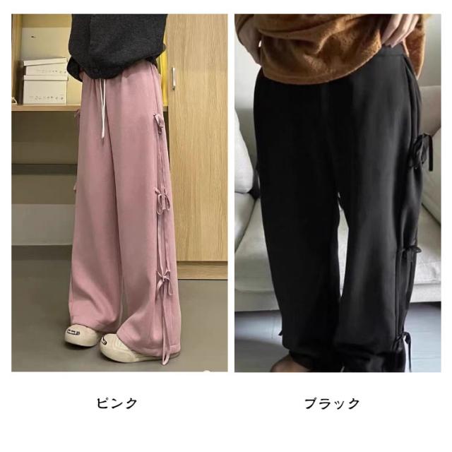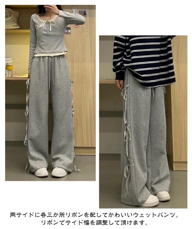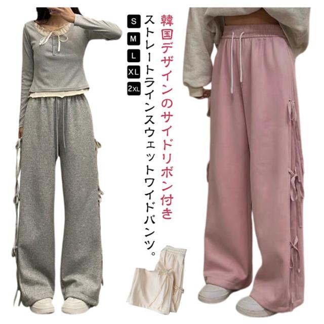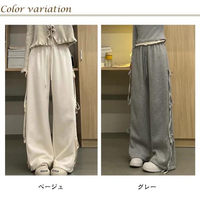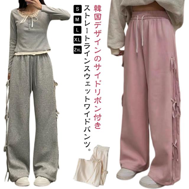 ワイドパンツ スウェットパンツ ボトムス スウェット ロングパンツ リボン 長ズボン サイドリボン ストレートパンツ ウエストゴム おしゃれ カジュアル 大きいサイズ ゆったり 韓国ファッション スウェットパンツ 薄手 春 夏 秋