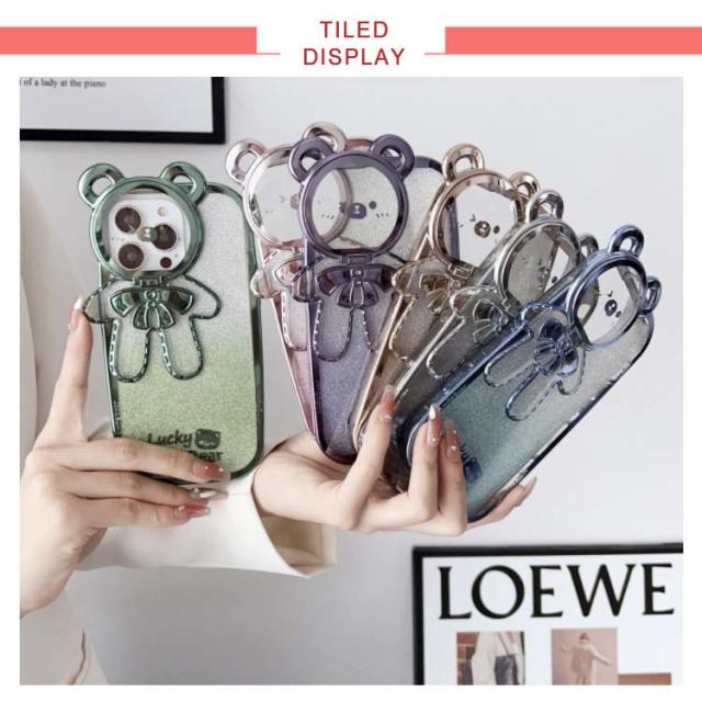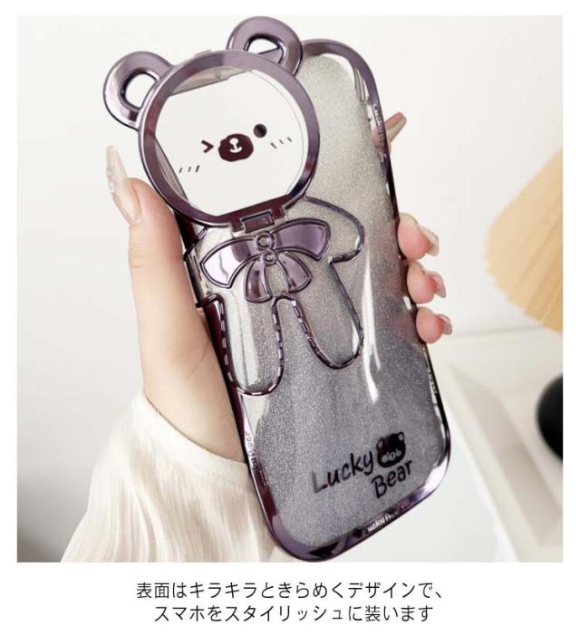| くま柄・カメラレンズ保護 表面はキラキラときらめくデザインで、スマホをスタイリッシュに装います ケースはカメラ位置までカバーして、衝撃や擦り傷からカメラレンズを保護します レンズカバーを開くとスタンドとして使用できるので、動画視聴に便利です ストラップ付き♪落下防止&持ち運び便利! | |