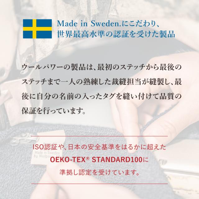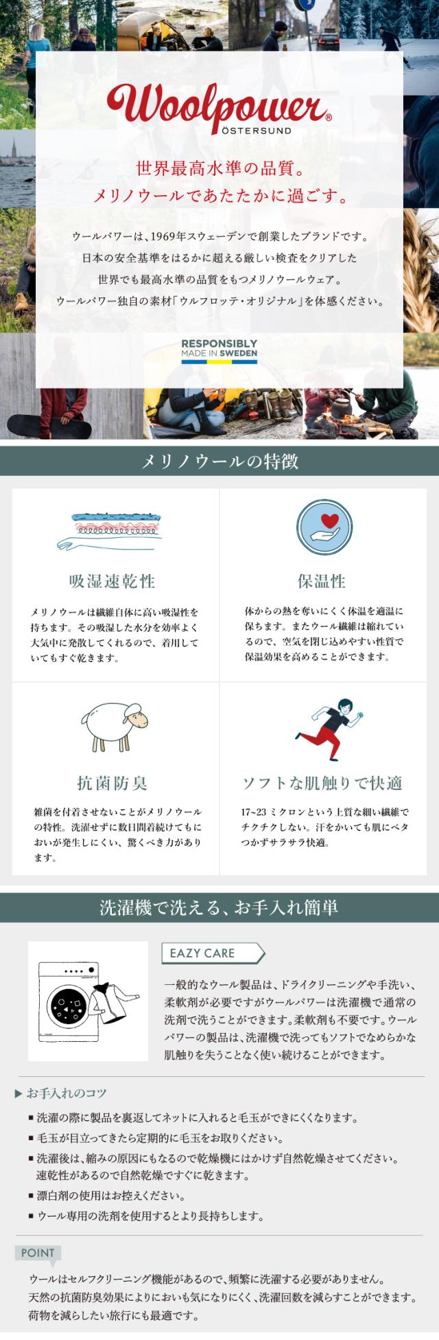スウェーデン北部にある街、エステルスンド。「ウールパワー」は50年ほど前に、この自然がとても美しい土地で創業しました。当時から流行に左右されないプロダクトを国内の自社工場で作ることにこだわり、スウェーデン品質の誇りと責任のもと、熟練の担当者による質の高い製品づくりを続けているメリノウールウェア専門ブランドです。最も高品質とされるメリノウールの中でも17~23ミクロンの極細繊維を使用し、ウールパワー独自の生地「ウルフロッテ・オリジナル」を開発。抜群の保温性を持ったチクチクしづらいウールウェアを完成させました。一度着用すれば、ソフトな肌触りや天然の消臭効果といった、ウール本来の機能性の虜になるはずです。