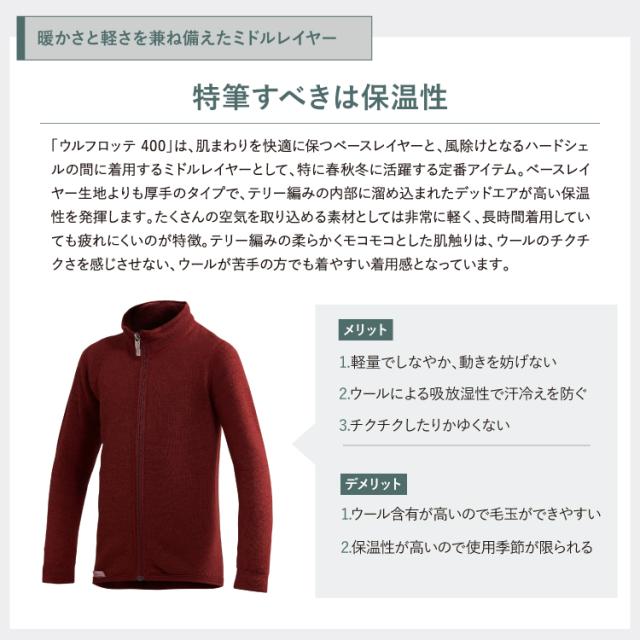 「フルジップ ジャケット 400」は、中間着としてしっかり保温したり、肌寒い時には軽く羽織ったりしてもおすすめの前開きのジャケットタイプ。ハイネックの襟元や、かがんだ時に背中が出ない丈は、より熱を逃さないように工夫されたデザインとなっています。アウトドア以外でも、日常で着用される方も多い一着で、豊富なカラーバリエーションとともにおしゃれも楽しめるプロダクトとなっています。また、首元には「Woolpower」のロゴが編み込まれています。スウェーデンのブランドらしく、スカンジナビアの人々の体型に合わせて作られているので、袖や丈は少し長く感じるかもしれません。特に女性や細身の男性は、通常着ているものよりもワンサイズ小さいものを選ぶのがおすすめです。