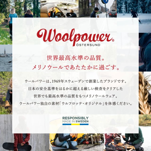 スウェーデン北部にある街、エステルスンド。「ウールパワー」は50年ほど前に、この自然がとても美しい土地で創業しました。当時から流行に左右されないプロダクトを国内の自社工場で作ることにこだわり、スウェーデン品質の誇りと責任のもと、熟練の担当者による質の高い製品づくりを続けているメリノウールウェア専門ブランドです。最も高品質とされるメリノウールの中でも17~23ミクロンの極細繊維を使用し、ウールパワー独自の生地「ウルフロッテ・オリジナル」を開発。抜群の保温性を持ったチクチクしづらいウールウェアを完成させました。一度着用すれば、ソフトな肌触りや天然の消臭効果といった、ウール本来の機能性の虜になるはずです。