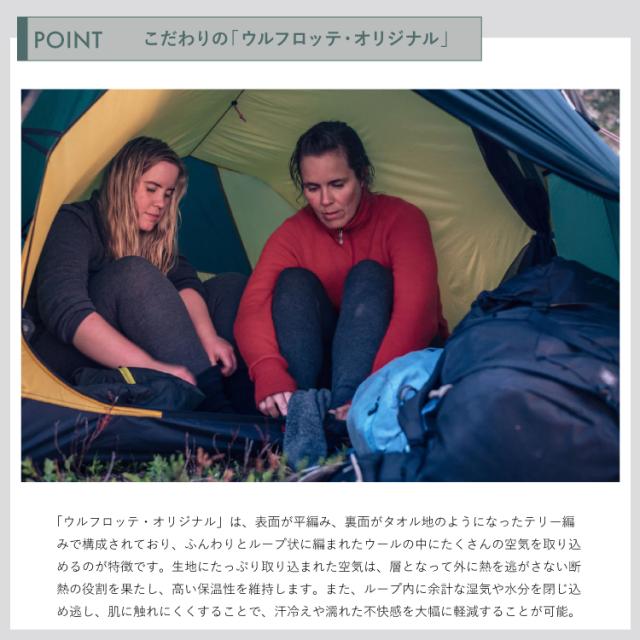 1970年代初頭にウールパワーが開発した生地「ウルフロッテ・オリジナル」は、表面が平編み、裏面がタオル地のようになったテリー編みで構成されており、ふんわりとループ状に編まれたウールの中にたくさんの空気を取り込めるのが特徴となっています。「生地の80%が空気」と言われるほど、生地にたっぷり取り込まれた空気は、層となって外に熱を逃がさない断熱の役割を果たし、高い保温性を維持します。また、ループ内に余計な湿気や水分を閉じ込め逃し、肌に触れにくくすることで、汗冷えや濡れた不快感を大幅に軽減することが可能。数日間の野営や縦走などでも、快適性を維持し活躍する、ウールパワーを代表する素材となっています。