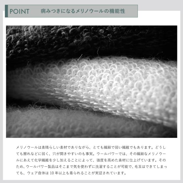 メリノウールは素晴らしい素材でありながら、とても繊細で弱い繊維でもあります。どうしても擦れなどに弱く、穴が開きやすいのも事実。ウールパワーでは、その繊細なメリノウールにあえて化学繊維を少し加えることによって、強度を高めた素材に仕上げています。そのため、ウールパワー製品はそこまで気を使わずに洗濯することが可能で、毛玉はできてしまっても、ウェア自体は10年以上も着られることが実証されています。 ※洗濯をする際は製品を裏返してネットに入れて洗濯機にお入れください。柔軟剤を入っていると縮む場合があります。 ※繊維の配合は商品によって異なります。