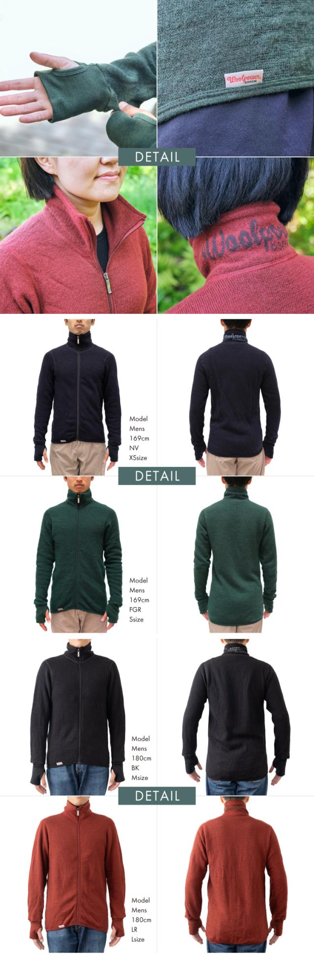 「フルジップ ジャケット 400」は、中間着としてしっかり保温したり、肌寒い時には軽く羽織ったりしてもおすすめの前開きのジャケットタイプ。ハイネックの襟元や、サムホールが付属した長めの手首まわり、かがんだ時に背中が出ない丈は、より熱を逃さないように工夫されたデザインとなっています。アウトドア以外でも、日常で着用される方も多い一着で、豊富なカラーバリエーションとともにおしゃれも楽しめるプロダクトとなっています。また、首元には「Woolpower」のロゴが編み込まれています。スウェーデンのブランドらしく、スカンジナビアの人々の体型に合わせて作られているので、袖や丈は少し長く感じるかもしれません。特に女性や細身の男性は、通常着ているものよりもワンサイズ小さいものを選ぶのがおすすめです。