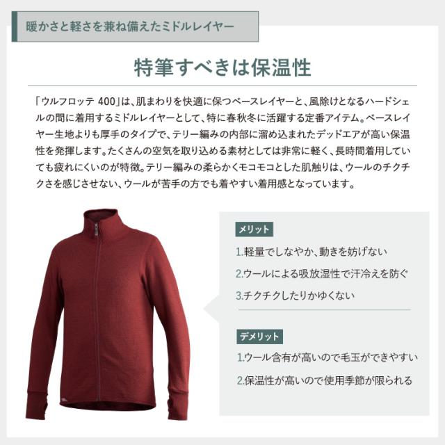 ウールパワー フルジップジャケット 400 Woolpower | 防寒 トップス ミドルレイヤー ユニセックス 極暖 ヒートテック 肌着 下着 防寒着 吸汗速乾 ウール メリノウール レディース メンズ 長袖 保温 あたたかい 暖かい 防臭 無地 さらさら