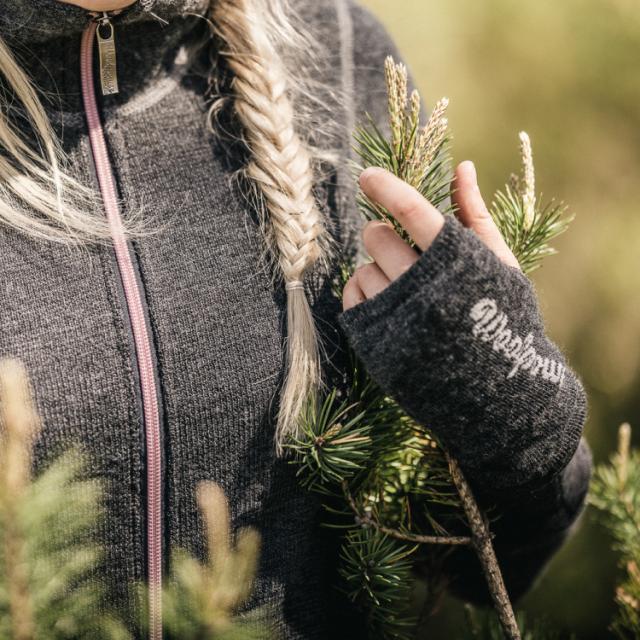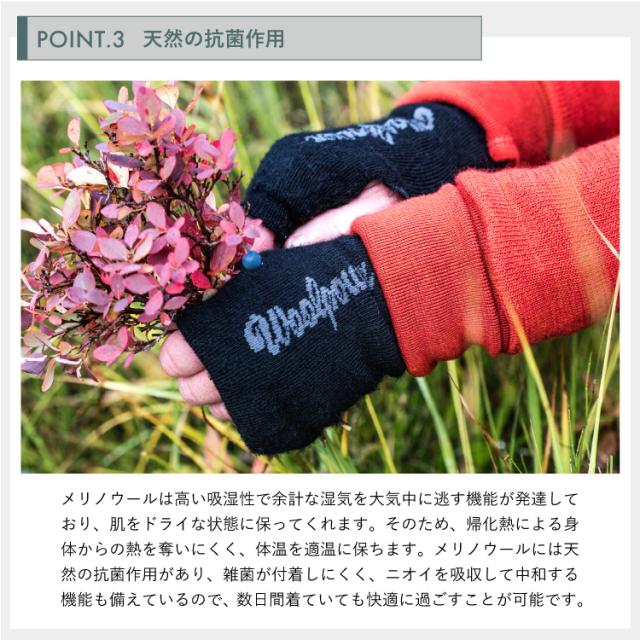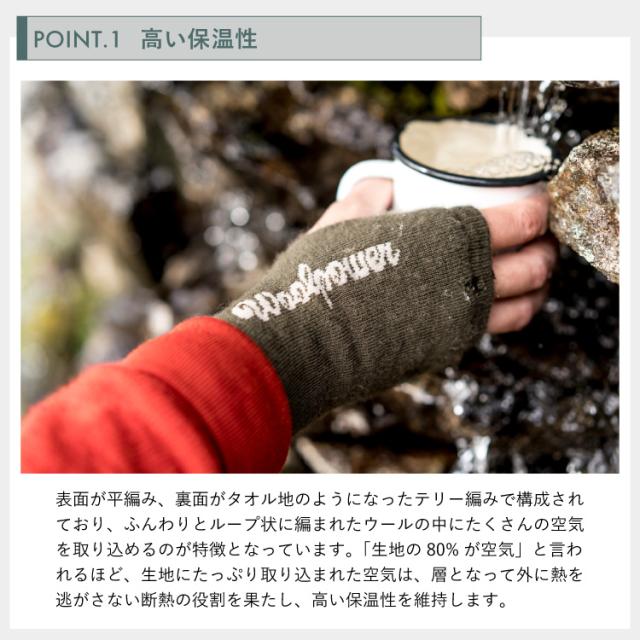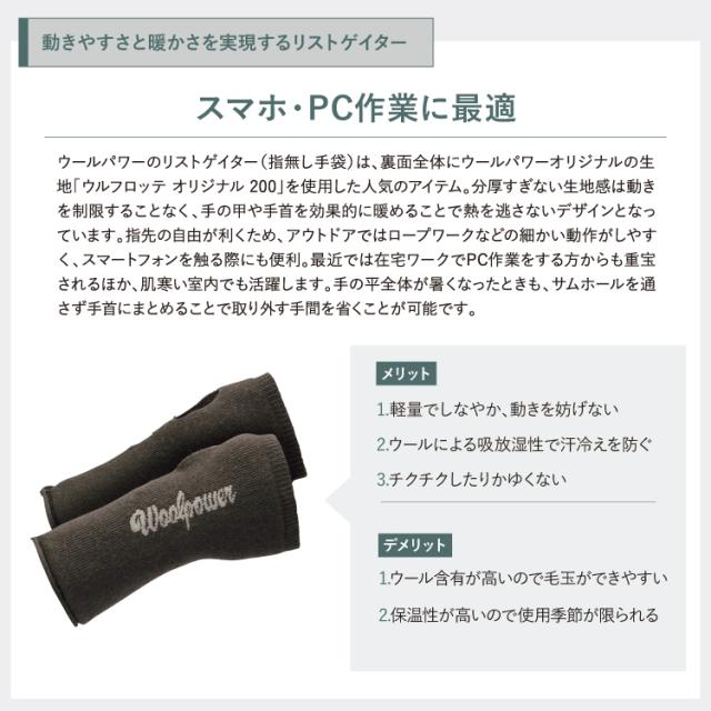 ウールパワーのリストゲイター(指無し手袋)は、裏面全体にウールパワーオリジナルの生地「ウルフロッテ オリジナル 200」を使用した人気のアイテム。分厚すぎない生地感は動きを制限することなく、手の甲や手首を効果的に暖めることで熱を逃さないデザインとなっています。指先の自由が利くため、アウトドアではロープワークなどの細かい動作がしやすく、スマートフォンを触る際にも便利。最近では在宅ワークでPC作業をする方からも重宝されるほか、肌寒い室内でも活躍します。手の平全体が暑くなったときも、サムホールを通さず手首にまとめることで取り外す手間を省くことが可能です。