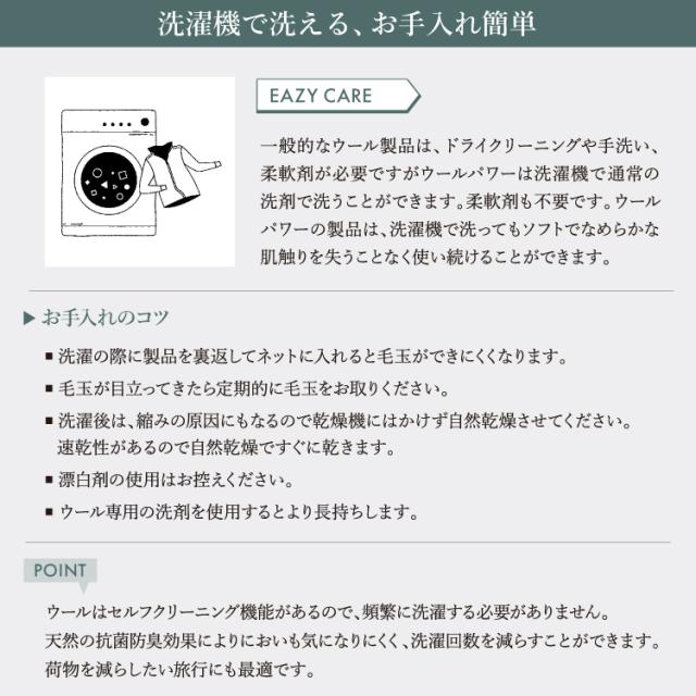 ・モニター環境により画像の色合いが若干異なる場合がございます。ご了承ください。 ・ウール製品なので毛玉ができる場合があります。毛玉取り等で定期的にお手入れすることをおすすめします ・ご自宅の洗濯機で洗濯は可能ですが、柔軟剤や漂白剤の使用はお控えください。 ・一般的な洗濯洗剤で洗濯可能ですが、ウール専用の洗剤を使用するとより長持ちします。 ・洗濯する際は、製品を裏返してネットに入れると毛玉が出にくくなります。 ・ウールはセルフクリーニングの機能があるので、他の衣服と比較して頻繁に洗う必要がありません。風通しの良い場所に干したりすることで洗濯の回数を減らせます。 |