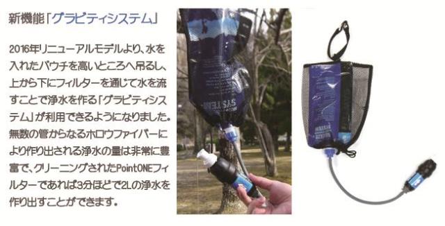 ボトルに組み込まれたタイプのフィルターと異なり、パウチやペットボトルを利用することで手持ちの水筒や容器にきれいな水を溜めて持ち運ぶことができます。また、新機能グラビティシステムにより素早く多くの量の浄水を作り出すことが可能になりました。