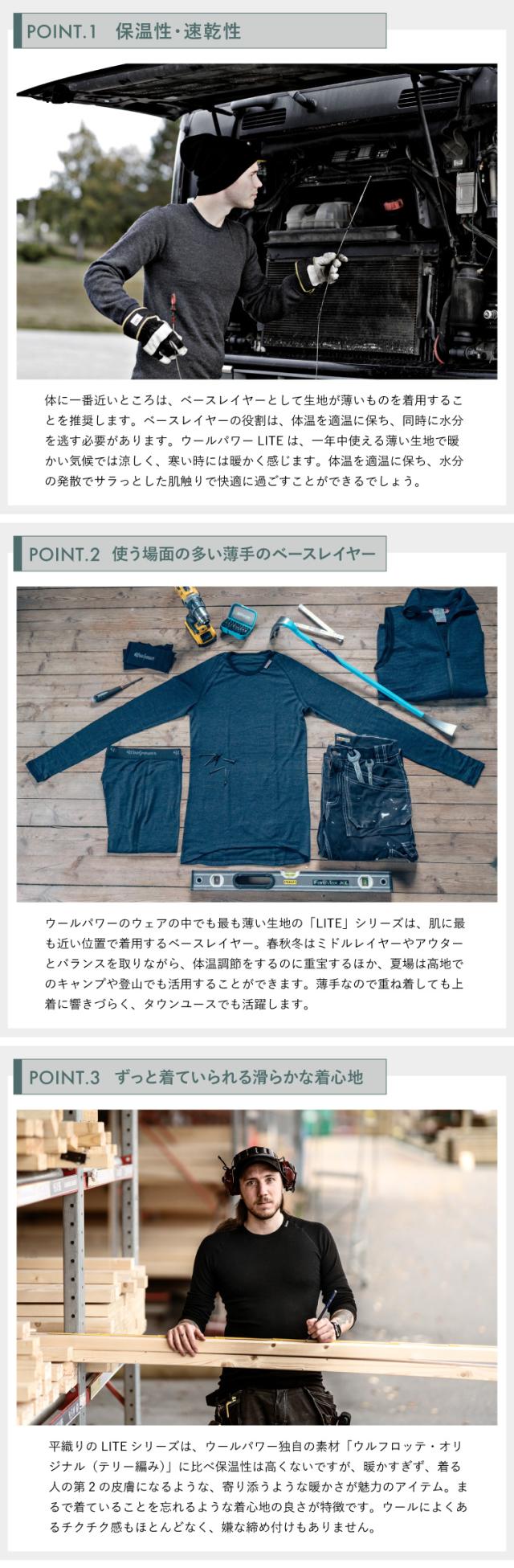 スウェーデン北部にある街、エステルスンド。「ウールパワー」は50年ほど前に、この自然がとても美しい土地で創業しました。当時から流行に左右されないプロダクトを国内の自社工場で作ることにこだわり、スウェーデン品質の誇りと責任のもと、熟練の担当者による質の高い製品づくりを続けているメリノウールウェア専門ブランドです。最も高品質とされるメリノウールの中でも17~23ミクロンの極細繊維を使用し、ウールパワー独自の生地「ウルフロッテ・オリジナル」を開発。抜群の保温性を持ったチクチクしづらいウールウェアを完成させました。一度着用すれば、ソフトな肌触りや天然の消臭効果といった、ウール本来の機能性の虜になるはずです。