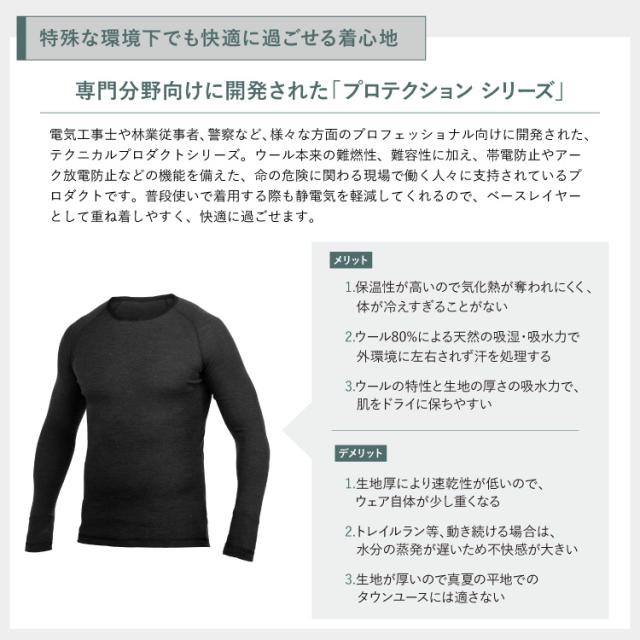 「ウールパワー プロテクション シリーズ」は電気工事士や林業従事者、警察など、様々な方面のプロフェッショナル向けに開発された、テクニカルプロダクトシリーズ。ウール本来の難燃性、難容性に加え、帯電防止やアーク放電防止などの機能を備えた、命の危険に関わる現場で働く人々に支持されているプロダクトです。普段使いで着用する際も静電気を軽減してくれるので、ベースレイヤーとして重ね着しやすく、快適に過ごせます。