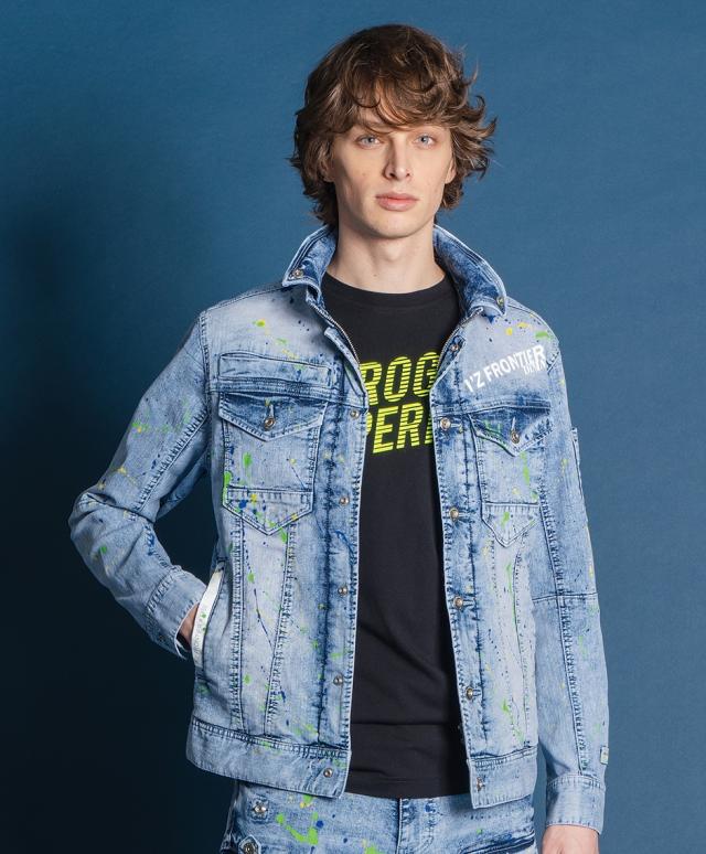 ケミカルウォッシュ+ブラスト+ピン打ち加工でワイルドテイストに仕上げ、そこにハンドメイドのペンキ散らしを加えポップ&ラグジュラリーテイストに仕上げました。