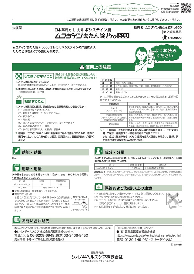 商品名 第2類医薬品 ムコダイン去たん錠Pro500 20錠 ※セルフメディケーション税制対象 容量 20錠 JANコード 4987904101407 メーカー シオノギヘルスケア カテゴリー 医療・介護・医薬品>医薬品>その他医薬品>その他医薬品【第一・二類医薬品(指定第二医薬品含む)】 効果・効能 たん 用法・用量 次の量を水またはぬるま湯でおのみください。また、おのみになる間隔は4時間以上おいてください。