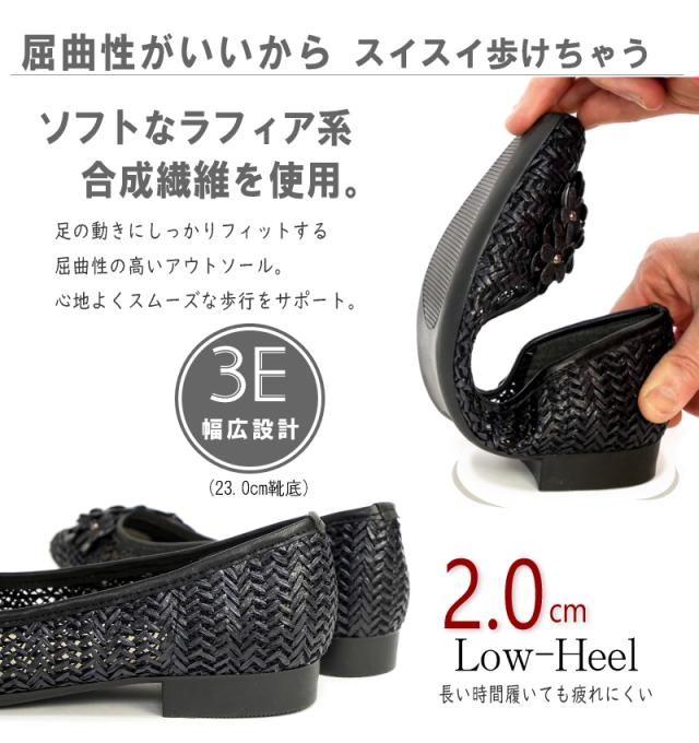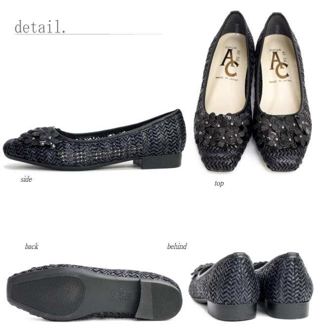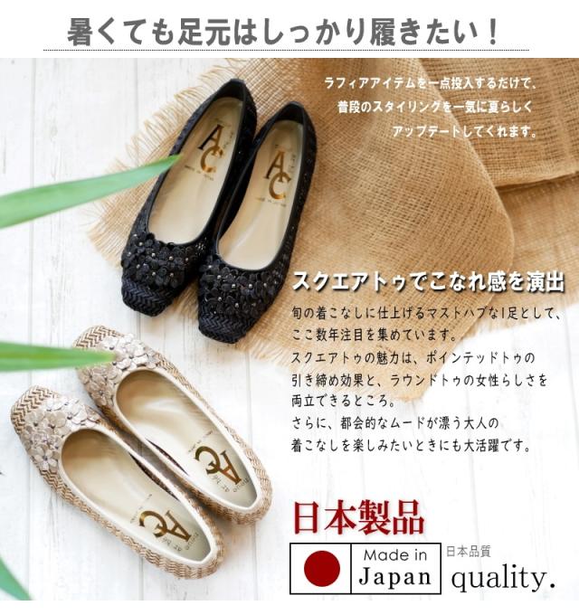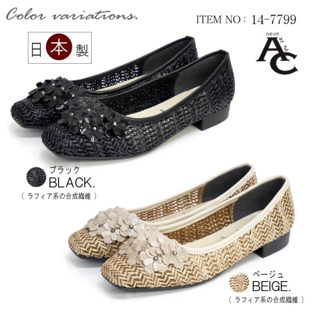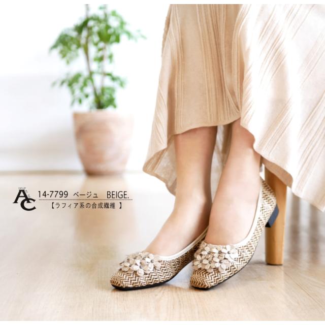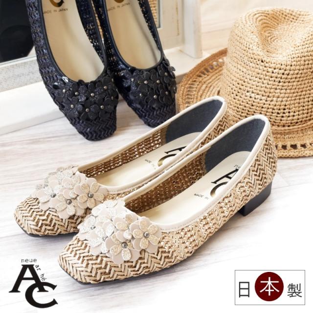 AC アミュエルコンセプト パンプス 靴 レディース ラフィア 清涼感 フラワーモチーフ 日本製 軽い スクエア 太目 ローヒール 黒 ベージュ 屈曲 お洒落 オフィス 仕事 通勤 旅行 3e 春 夏