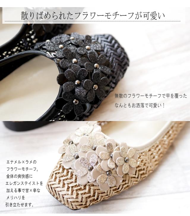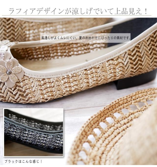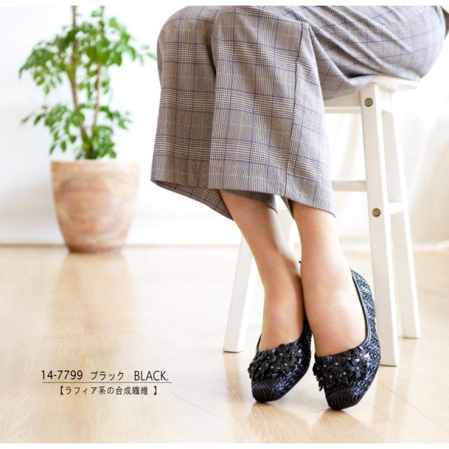 日本製・ラフィア素材!スクエアトゥ・フラワーディテール・ローヒールパンプス