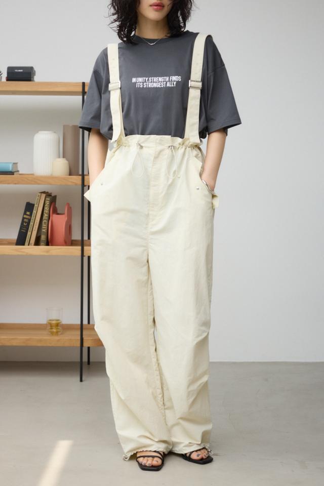 ■商品(デザイン)ポイント : さらりとした風合いのナイロン素材を使用したサスペンダー付パンツです。