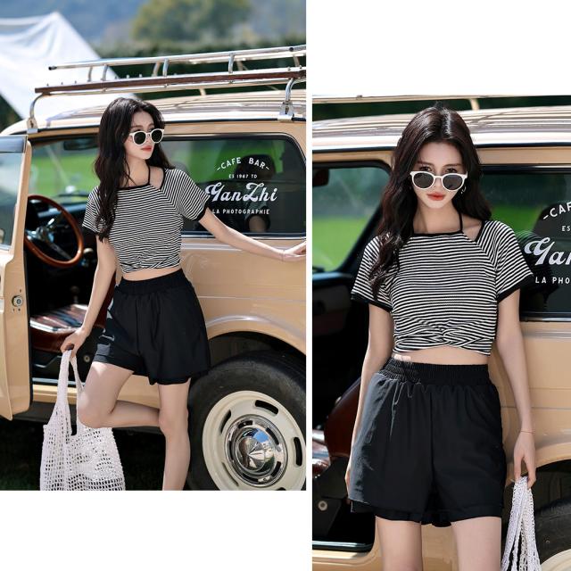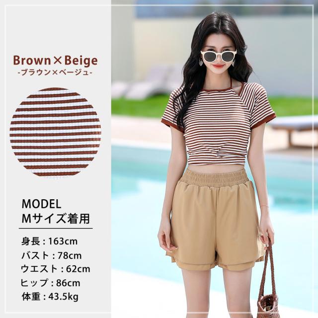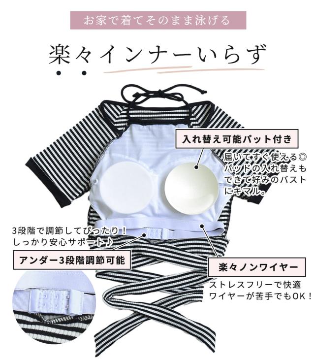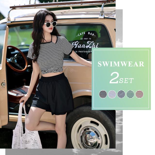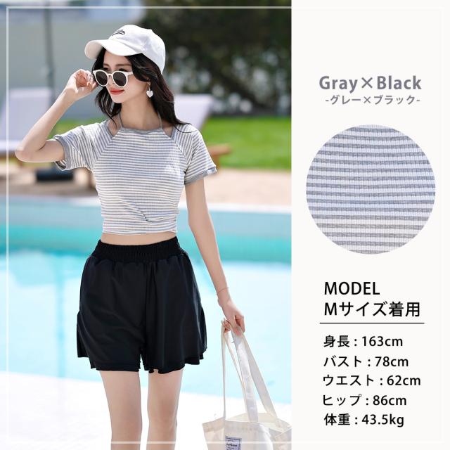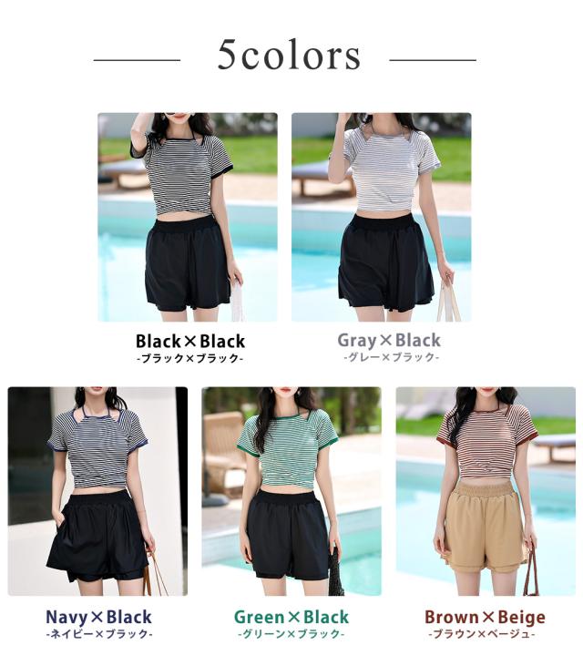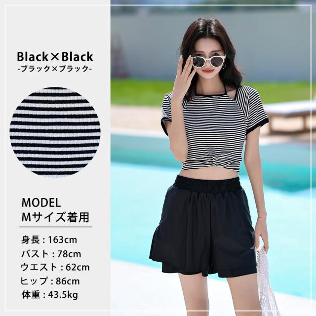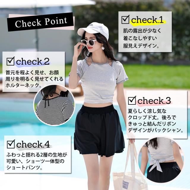 春新作 水着 レディース 体型カバー 2点セット 半袖 クロップド丈 ブラ一体型トップス ホルターネックデザイン ボーダー リブ生地 2重 ショートパンツ ポケット ファスナー付き ノンワイヤー パッド付き バスト 盛れる 二の腕 ウエスト ヒップ 太もも カバーアップ 黒