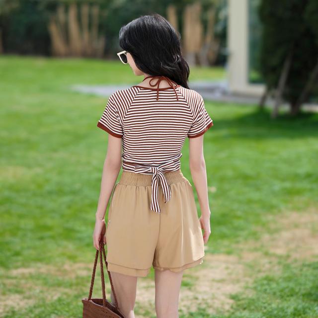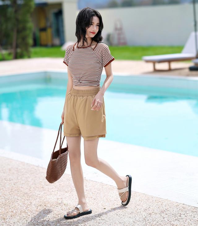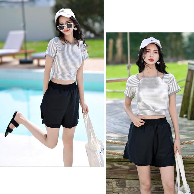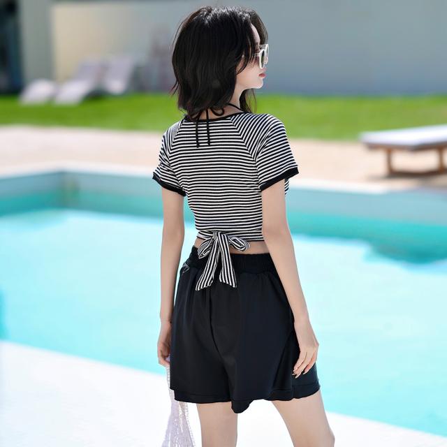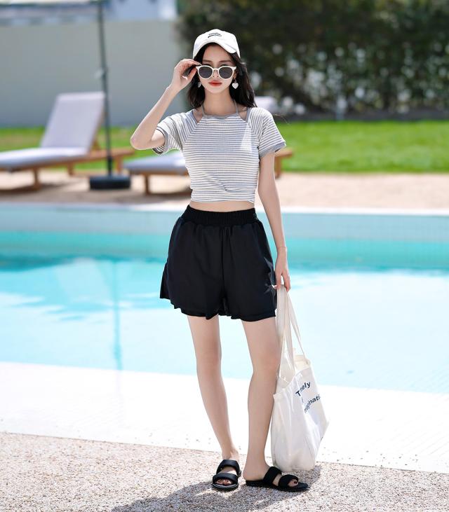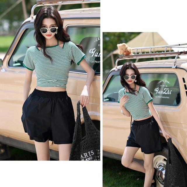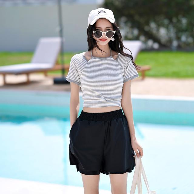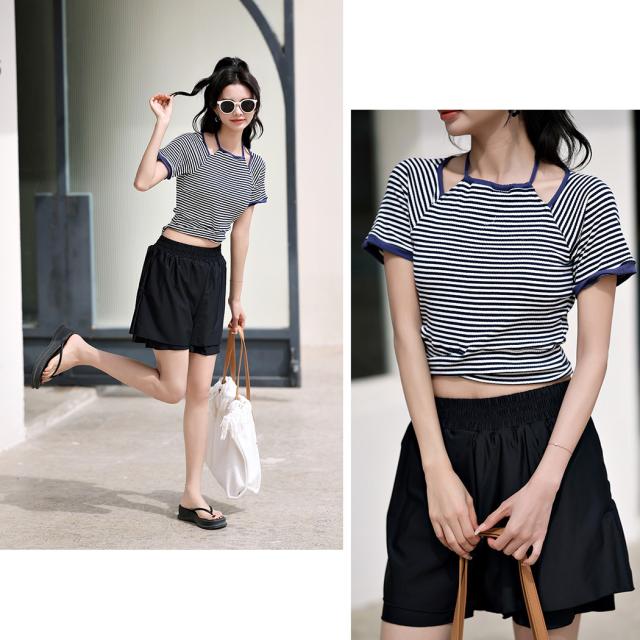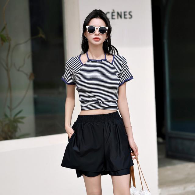 春新作 水着 レディース 体型カバー 2点セット 半袖 クロップド丈 ブラ一体型トップス ホルターネックデザイン ボーダー リブ生地 2重 ショートパンツ ポケット ファスナー付き ノンワイヤー パッド付き バスト 盛れる 二の腕 ウエスト ヒップ 太もも カバーアップ 黒