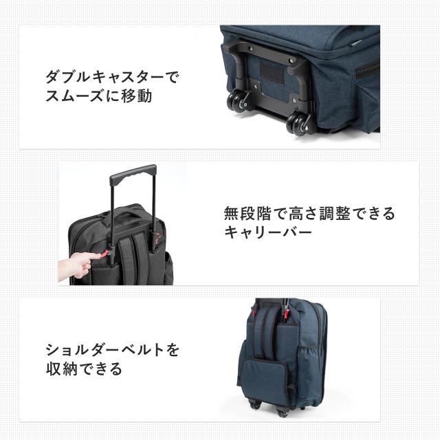 ⇒ご購入の前にご確認下さいビジカジスタイルに合うキャリーリュック。ダブルキャスターで多い荷物を楽に運べるリュックキャリー。荷物の出し入れがしやすく、荷物が崩れにくい固定ベルト付き。35リットル。ブラック。【WEB限定商品】