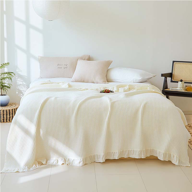 手触りの良いワッフル生地をふんだんに使ったベッドスプレッドです。
